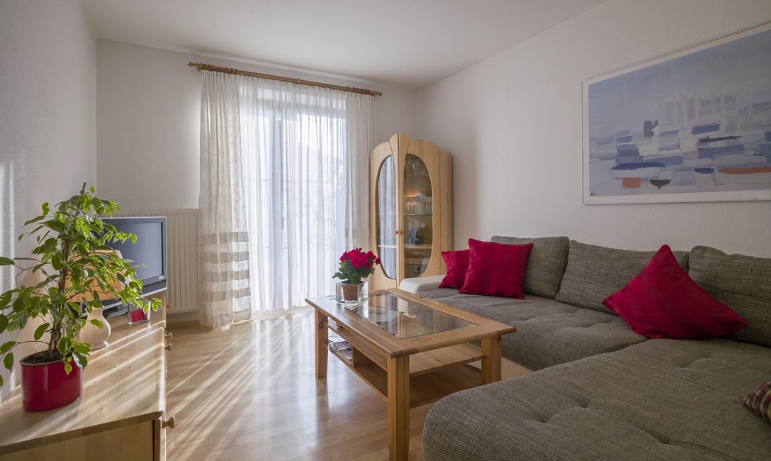 74m², familienfreundliches behindertengerechtes Appartement, eigener Eingang, 2 Gartenterrassen SW, Küche mit Esstisch, 1.Schlafzimmer mit DU, 2.Schlafzimmer mit Waschpl., extra Badezimmer, 2WC, 1Wohnzimmer mit Schlafcouch, 4 Erwachsene und 2 Kinder