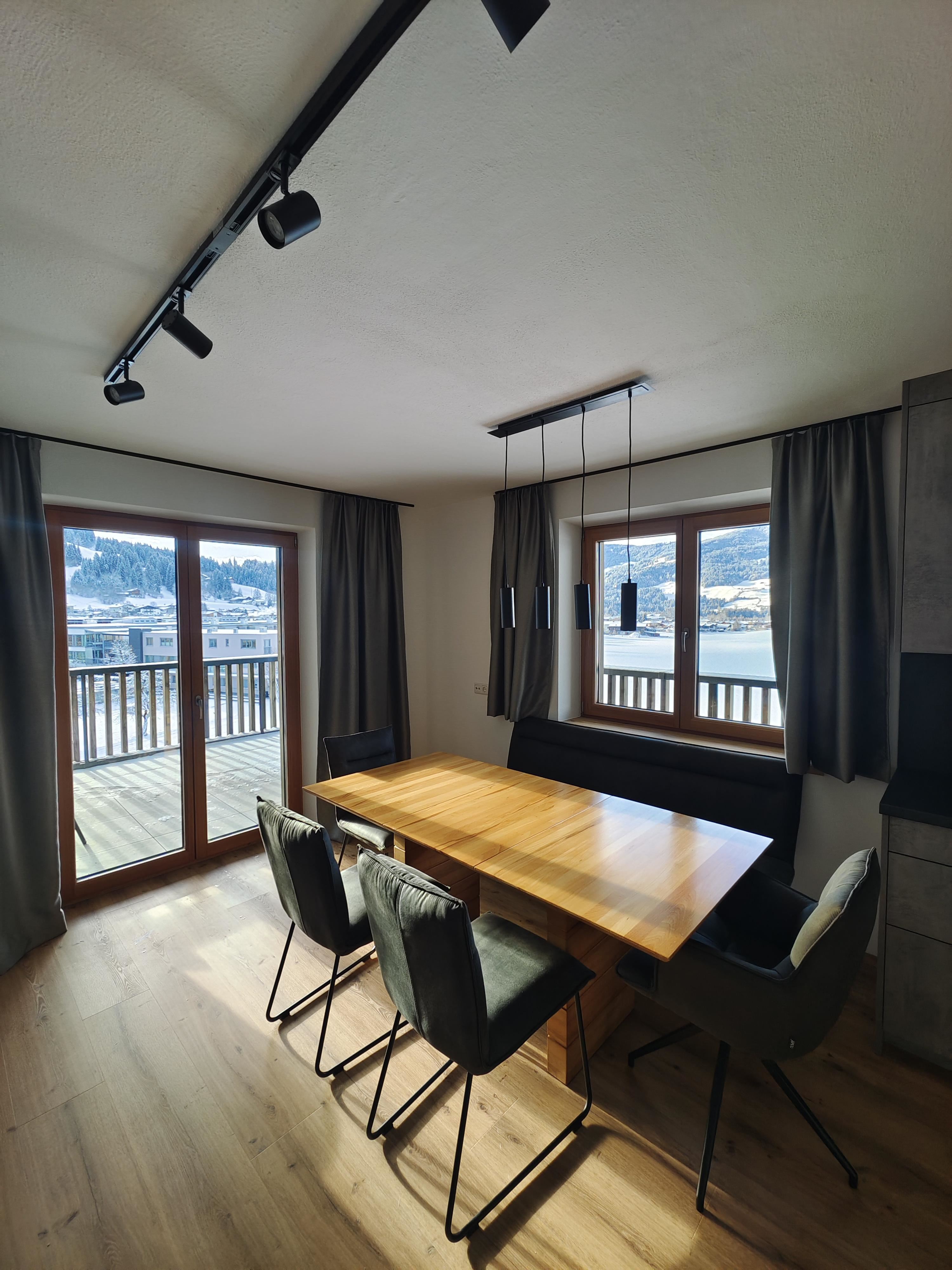 Wohnzimmer mit Panorama Fronten, Esszimmer mit Küche, 3 Schlafzimmer, 1x Bad/WC, 1x Dusche, 1x WC.