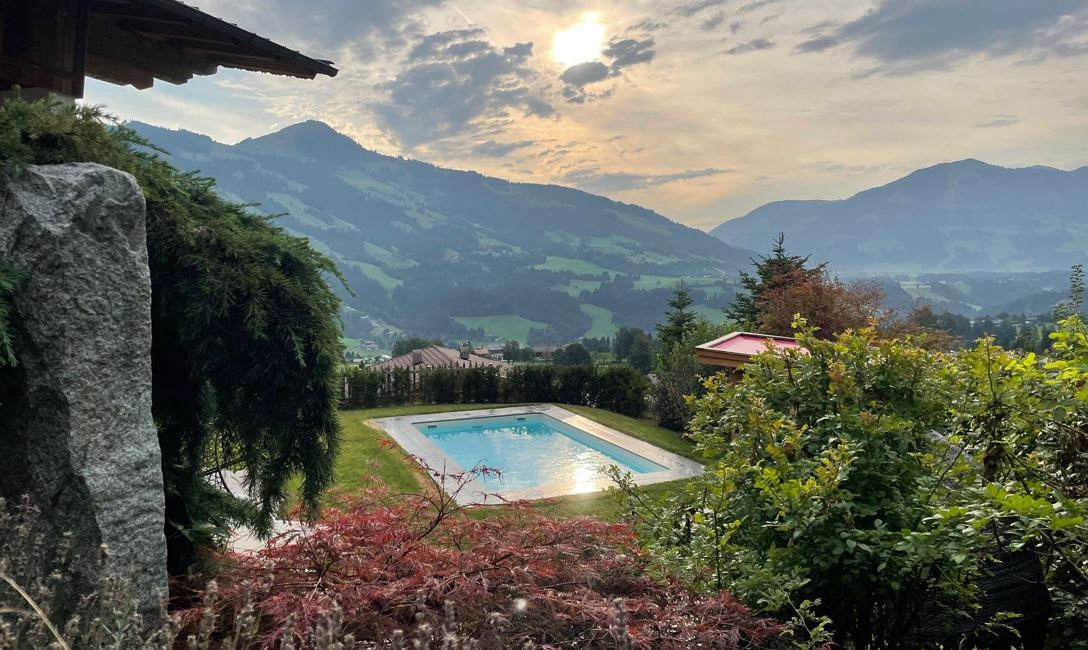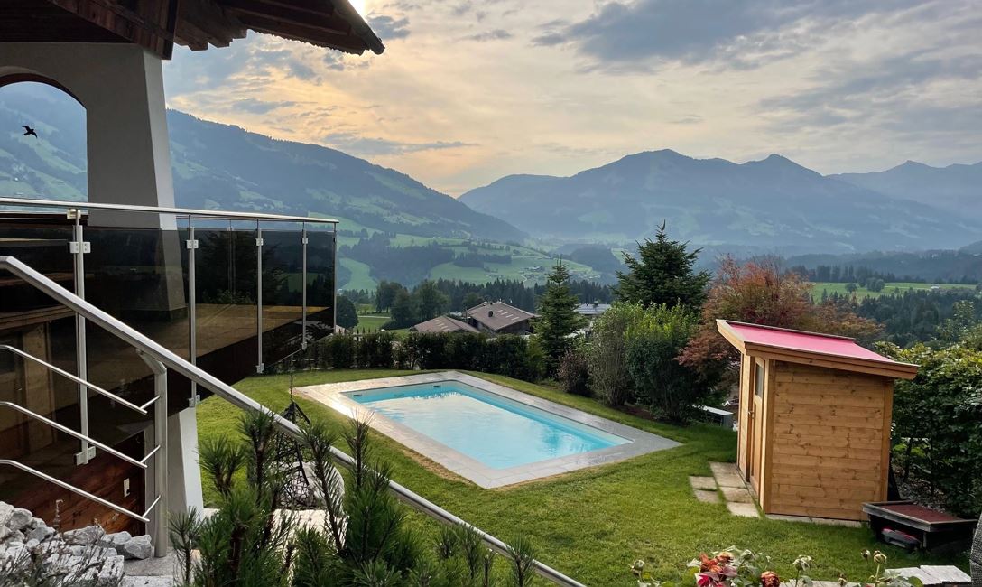 Genießen Sie Ihre Auszeit in unserer Panorama-Zirben Sauna mit Ausblick auf die Kitzbühler Alpen und gemütlichem Ruheraum der keine Wünsche offen lässt.
