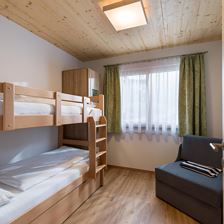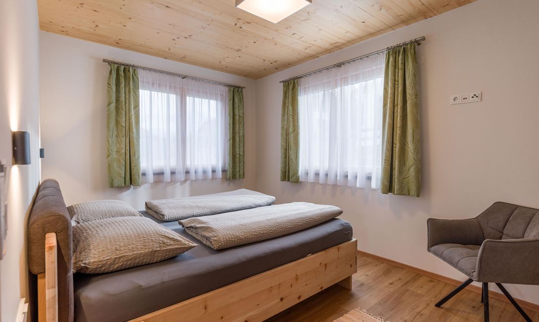 Ausgestattet jeweils mit 2 getrennten Schlafzimmern, einmal ein großes Doppelbett aus Zirbenholz, einmal mit Stockbett und eine Schlafcouch im Wohnbereich.