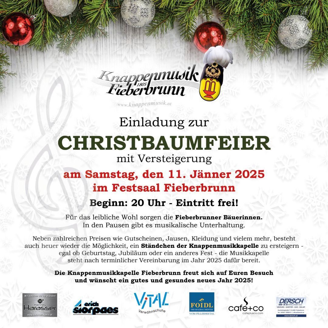 Traditionelle Christbaumversteigerung der Knappenmusikkapelle im Festsaal Fieberbrunn, es warten wieder tolle Versteigerungsobjekte auf die Besucher, darunter auch wieder ein Ständchen der ganzen Musikkapelle. Für das leibliche Wohl sorgen die Fieberbrunner Bäuerinnen mir regionalen Köstlichkeiten aus eigener Erzeugung. In den Pausen gibt es musikalische Unterhaltung | Kosten: frei | Treffpunkt: Festsaal Fieberbrunn, Dorfplatz 1, 6391 Fieberbrunn