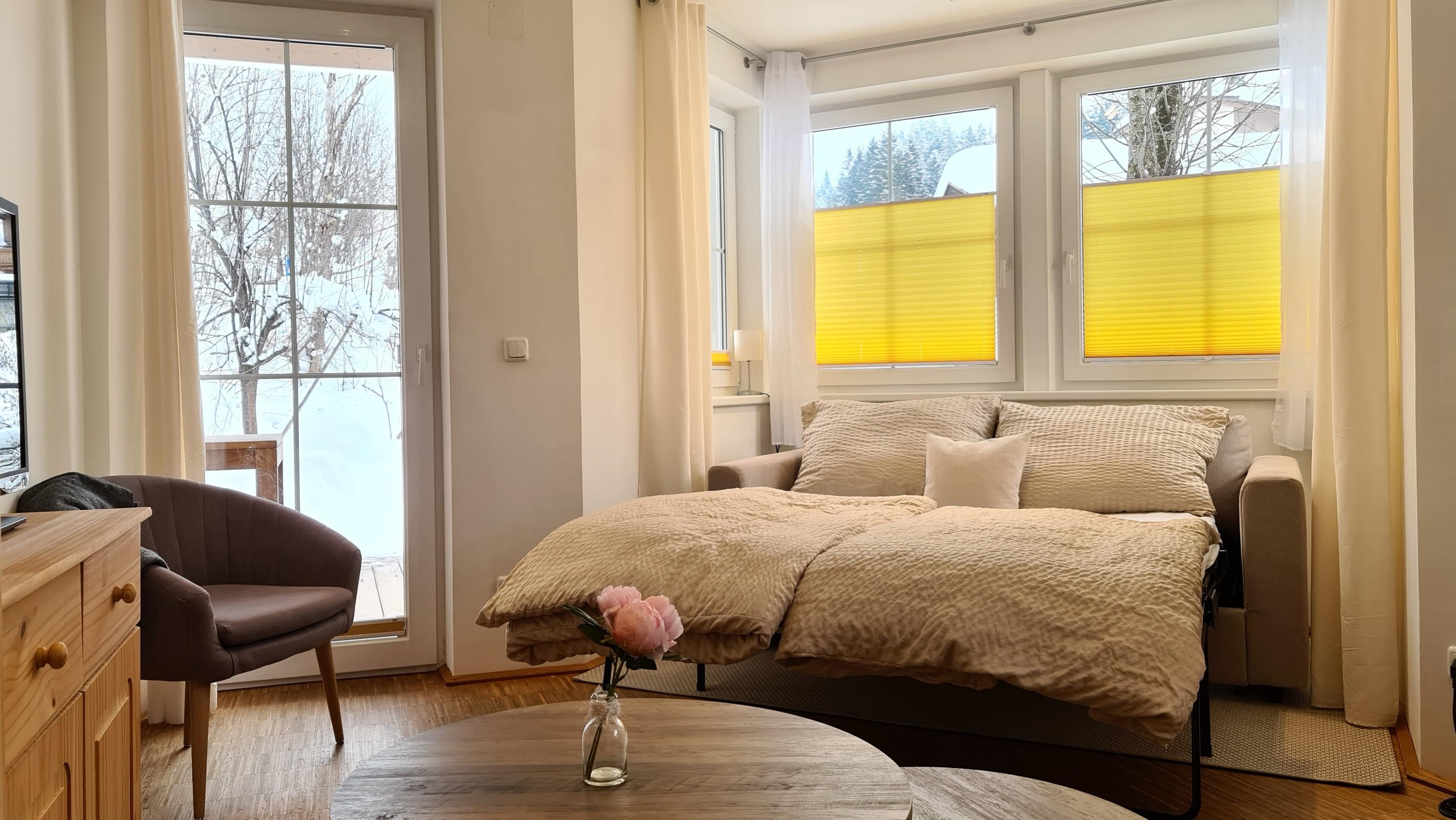 "Komfort"-Chalet mit Terasse und Garten: liebevoll eingerichtetes Chalet mit einem Schlafzimmer, großzügigem Wohnzimmer mit Schlafcouch, Küche und einem Bad.