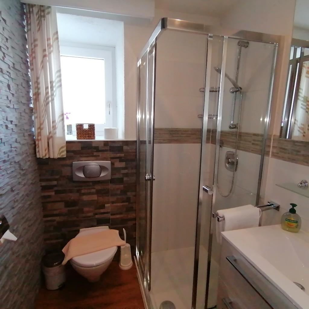 – Badezimmer mit Dusche, WC, Waschbecken, Fön
