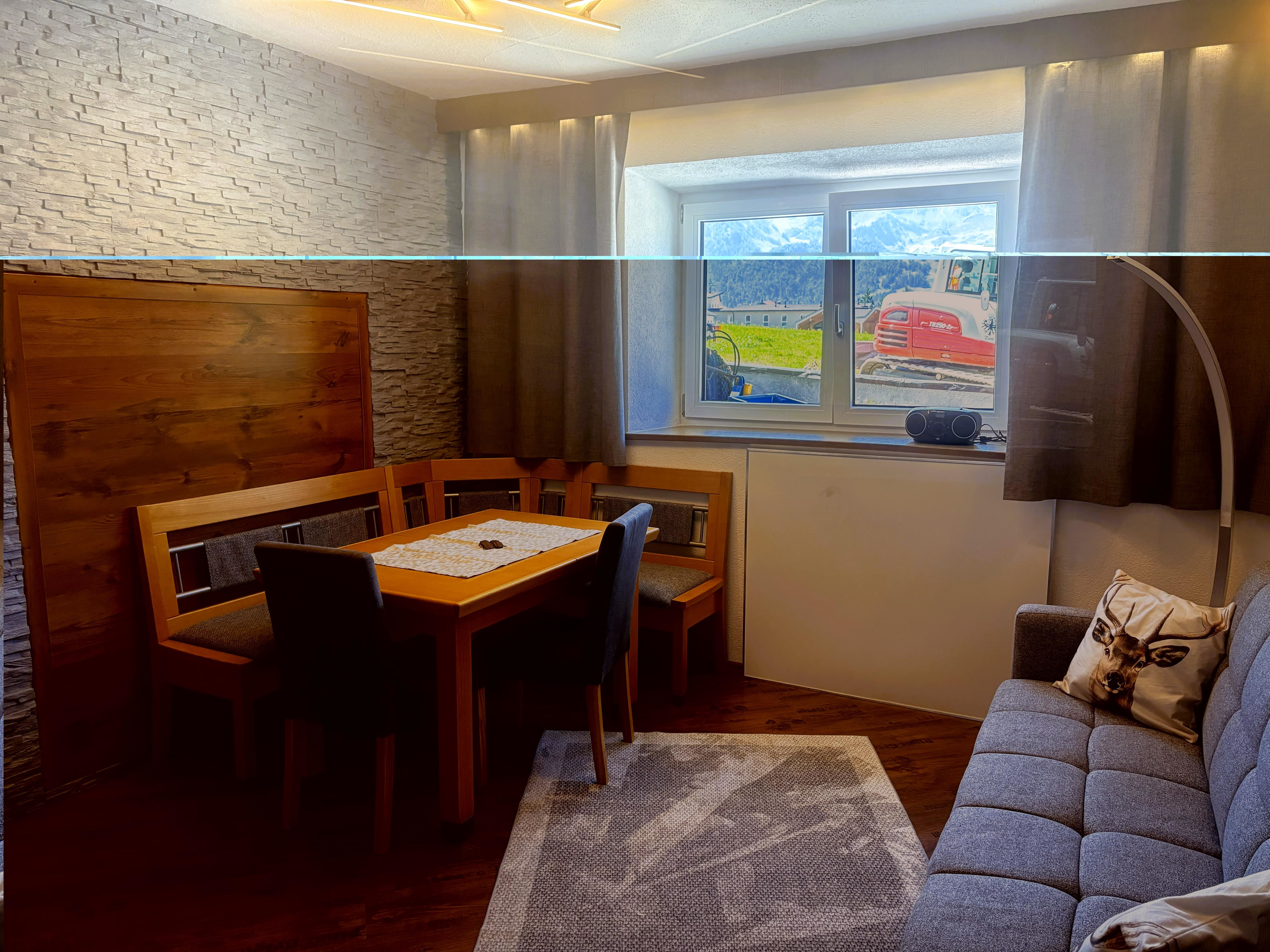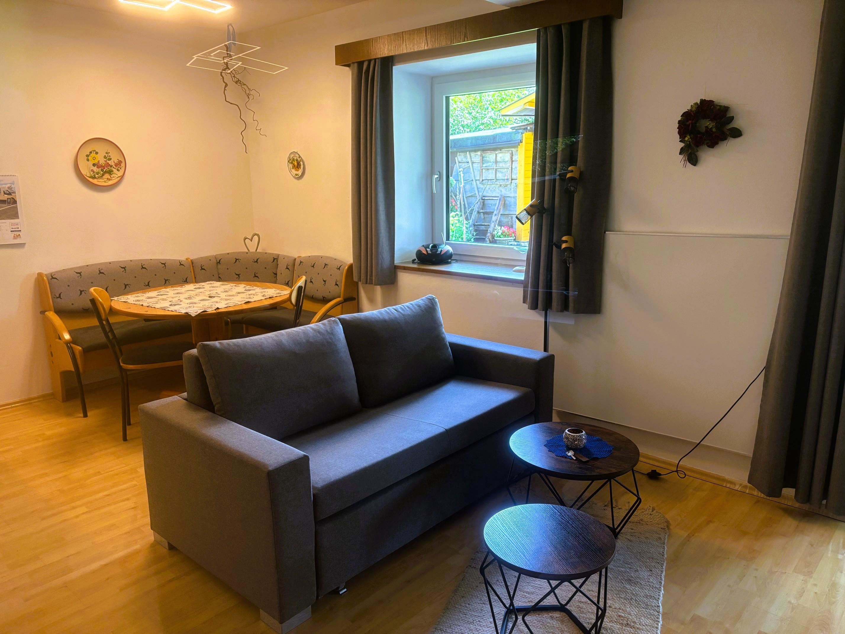 – Wohnzimmer mit Esstisch und Sofa