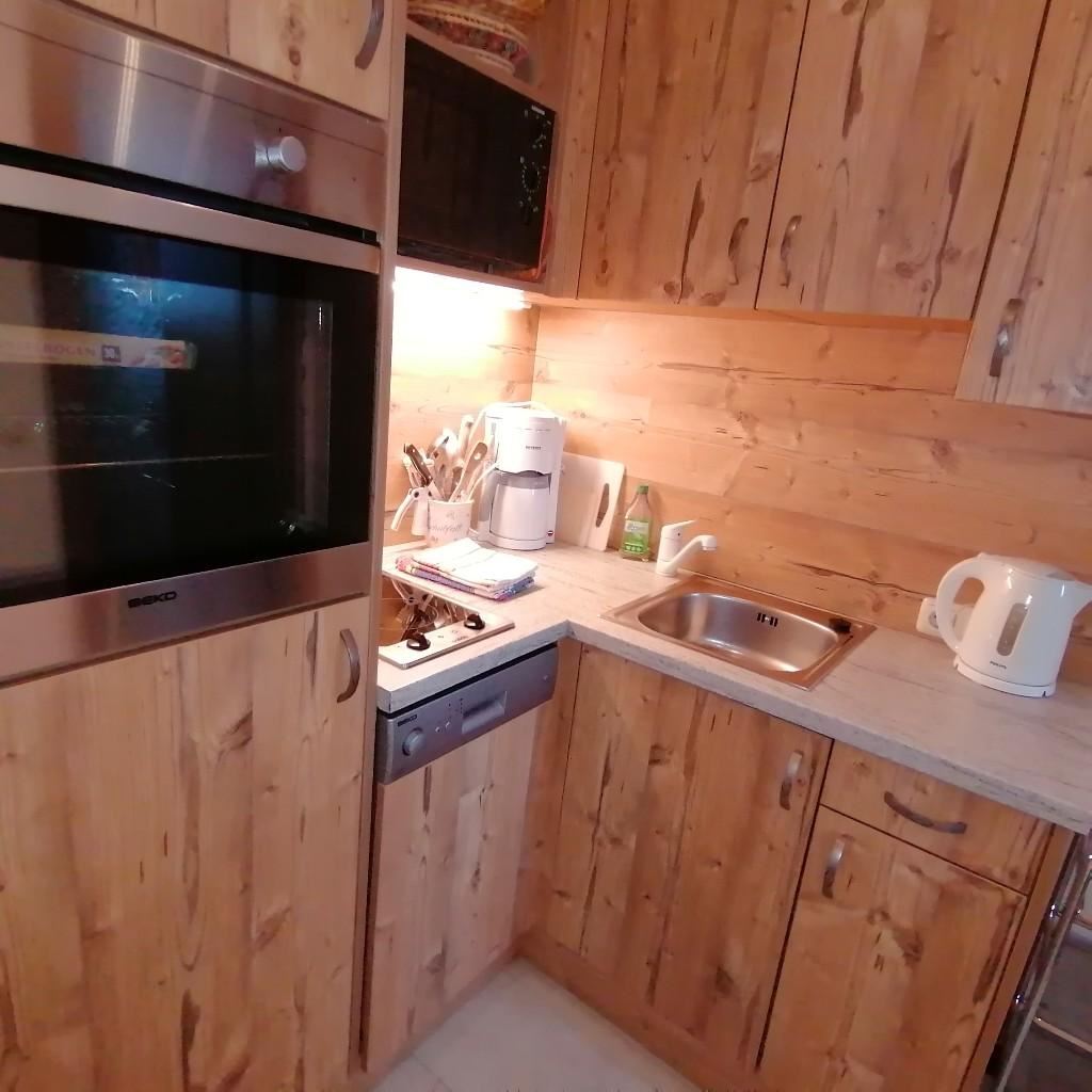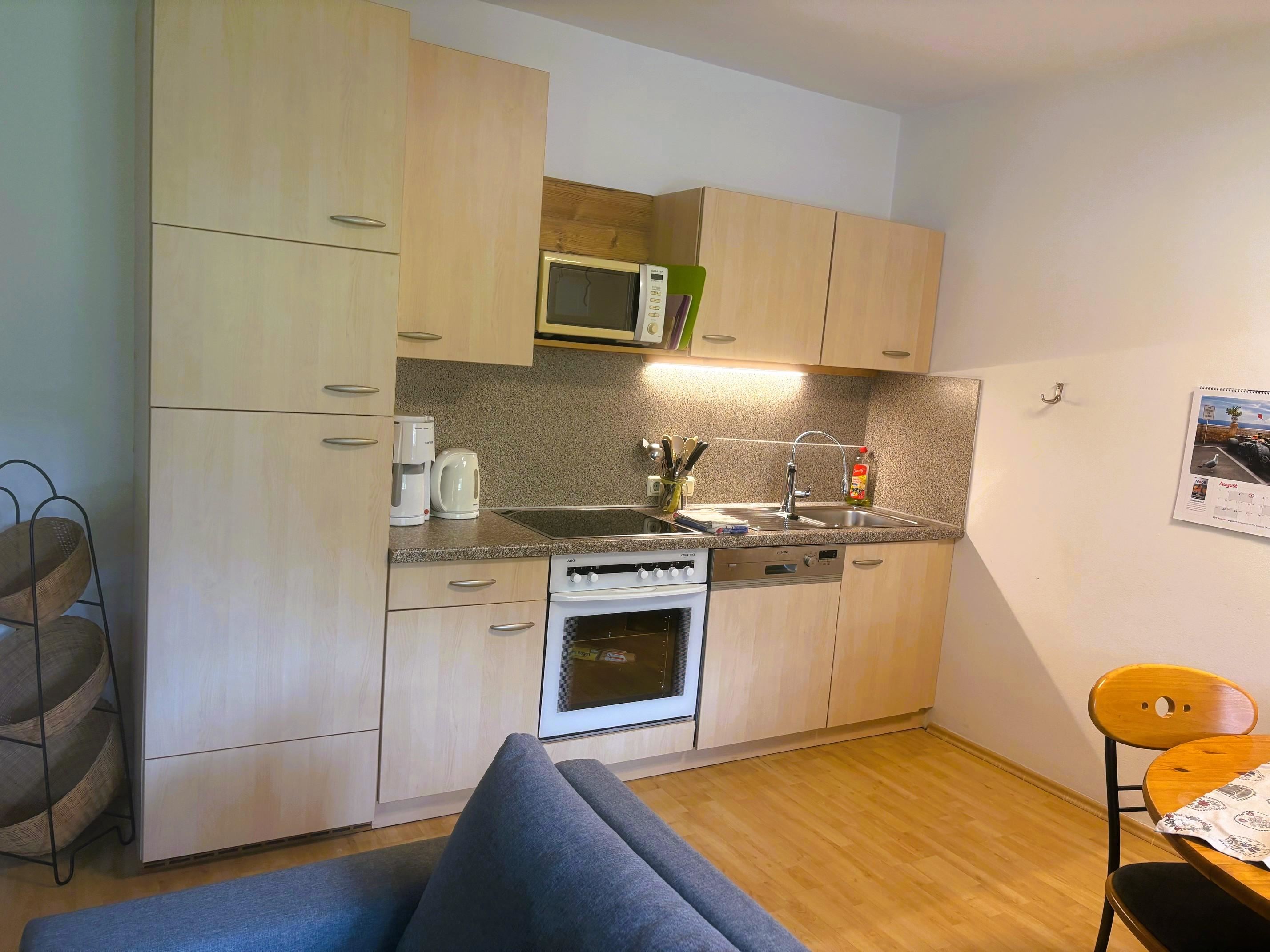 – Küche mit 2 Ceranfeld, Mikrowelle, Kühlschrank mit Gefrierfach, Backofen, Geschirrspülmaschine, Kaffeemaschine, Wasserkocher, Toaster, Küchenutensilien