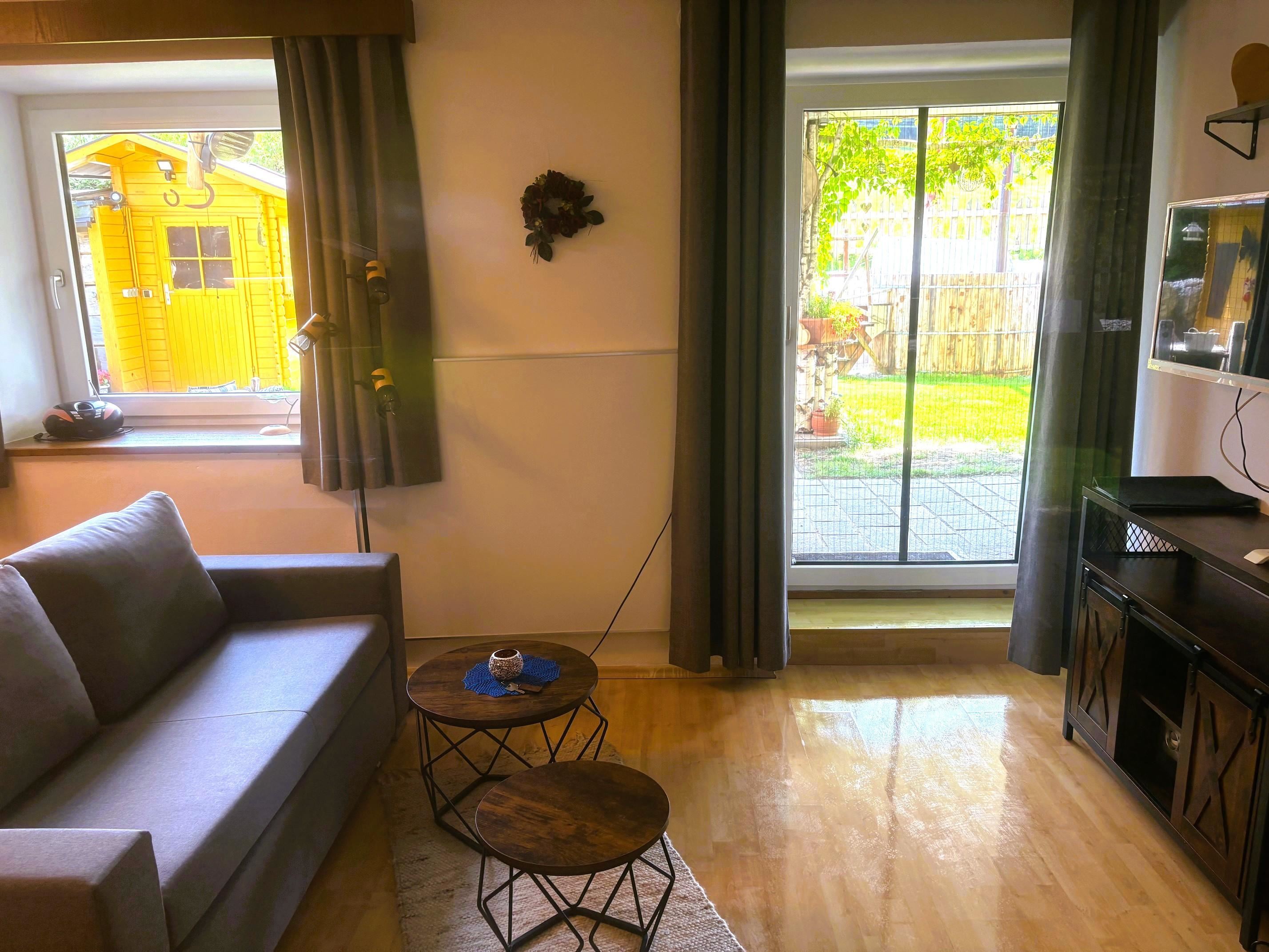 Gemütlich eingerichtete Wohnung (südseitig) mit: Vorraum, Bad/WC, großes Wohnzimmer mit Kochnische und Doppelausziehcouch,Schlafzimmer mit Doppelbett, Balkon im 2. Stock, Terrasse im Parterre, ca. 55 m². Alle FeWo-s sind mit Geschirrspülmaschine, Backofen, Kabel-TV, Radio, W-Lan, Bettwäsche, Handtücher, Haarfön ausgestattet!