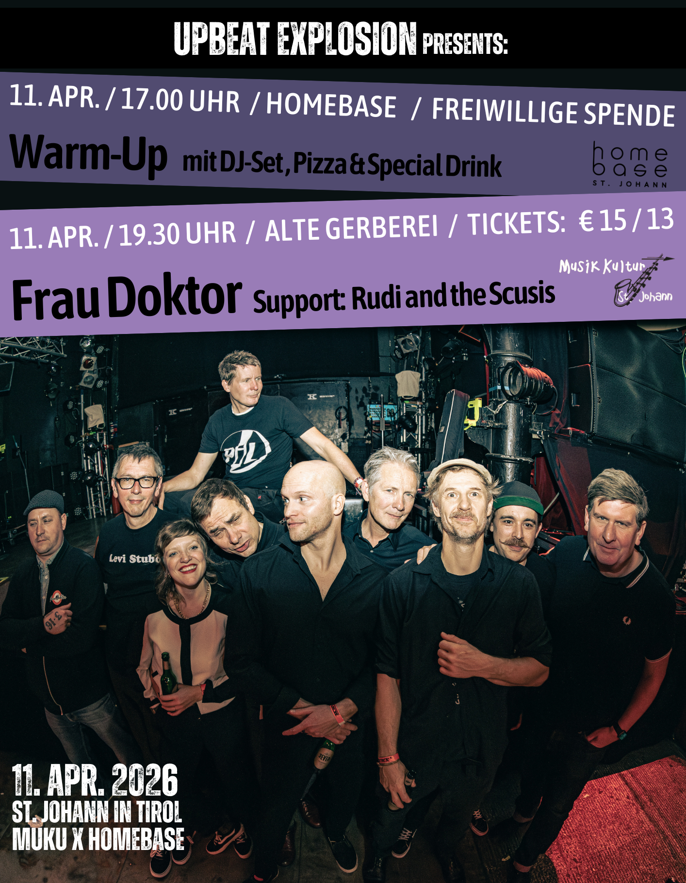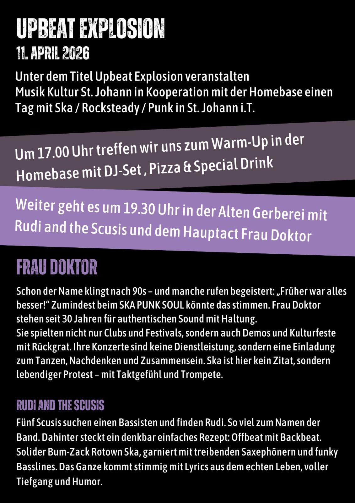 Ab 17.00 Warm-Up in der Homebase mit DJ-Set (Ska-Punk-Rocksteady) & frische Pizza & SKAmpari Soda.