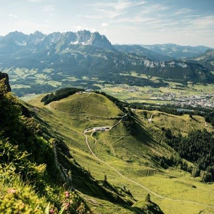 Von der Bergstation Harschbichl gehen Sie ein kurzes Stück entlang des Schotterweges leicht abwärts und danach gleich wieder bergauf. In zahlreichen Kehren schlängelt sich der Bergpfad über steile Almwiesen und wird auf halber Höhe zum Steig. Der Ludwig-Scheiber-Steig ist an der schmalsten Stelle mit einem Stahlseil gesichert und bietet ein atemberaubendes Kaiserpanorama. Nach dem Durchschreiten des imposanten Felsentors wandern Sie wenige Meter entlang der Straße, zuletzt über Almwiesen, vorbei an einer Kapelle und sind dann am Gipfel des Kitzbüheler Horns. Dort angekommen beginnt östlich der Abstieg am schmalen Grat entlang in Richtung der „Hoferschneid“. Hier wird Trittsicherheit gefordert, auch wenn der einzigartige Ausblick auf die umliegenden Berge noch so verlockend ist. Von der Hoferschneid zweigt dann der „Jägersteig“ ab und führt Sie stets abwärts zurück bis zur Bergstation der Harschbichlbahn. Dort angekommen können Sie dann entweder ins Tal wandern oder bequem mit der Gondel hinunter fahren. TIPP! Unbedingt den Alpenblumengarten zwischen Gipfelhaus und Alpenhaus besuchen.