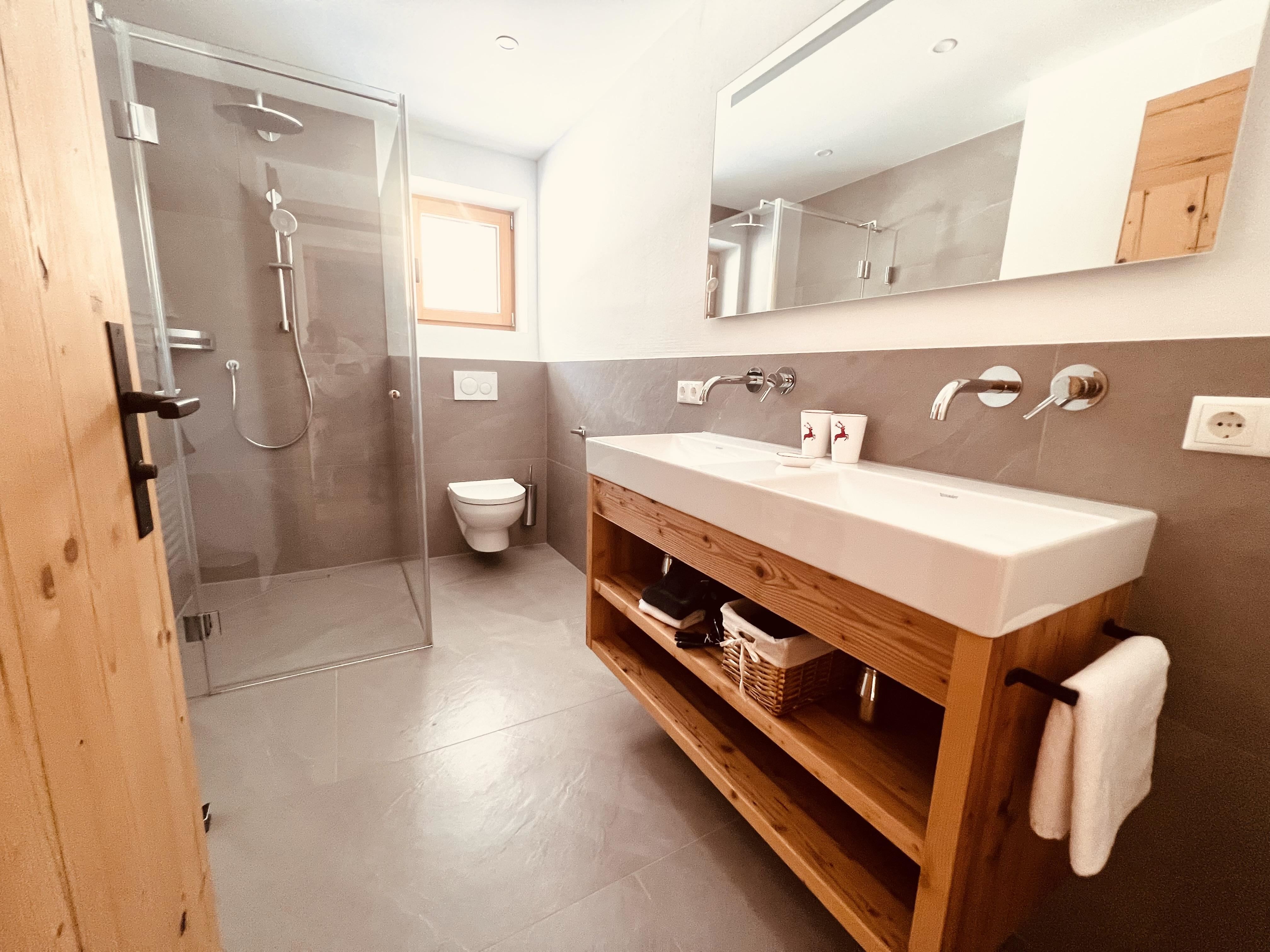 The chalet is a detached house with two floors. Each floor features a high-quality apartment, both with a south-facing terrace furnished with lounge furniture, dining table, garden, and private entrance. Generous window areas create bright rooms and offer a wide view of the mountain world of the Kitzbühel Alps.