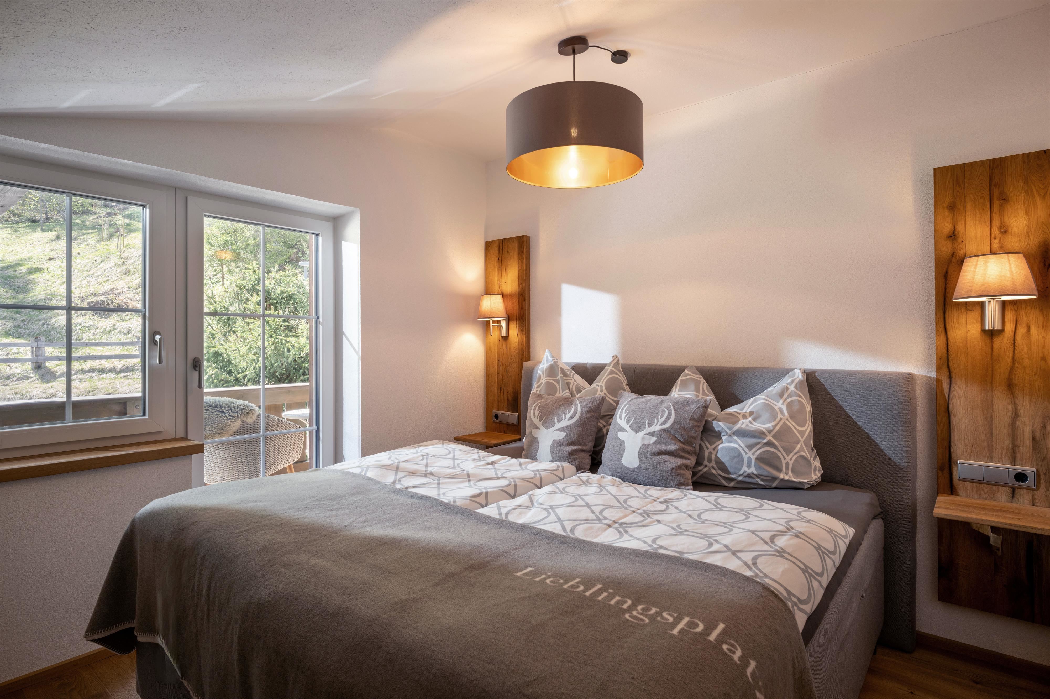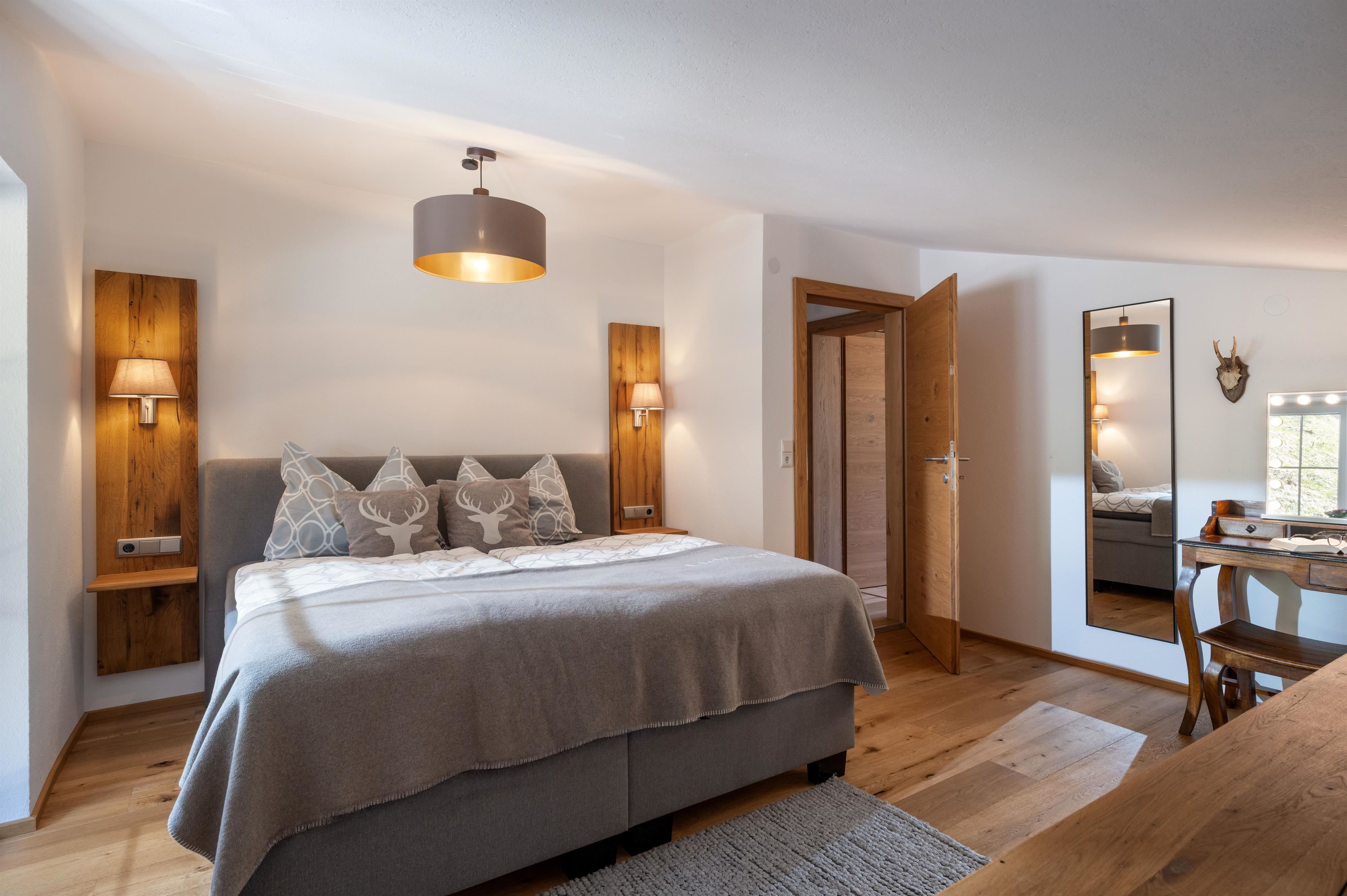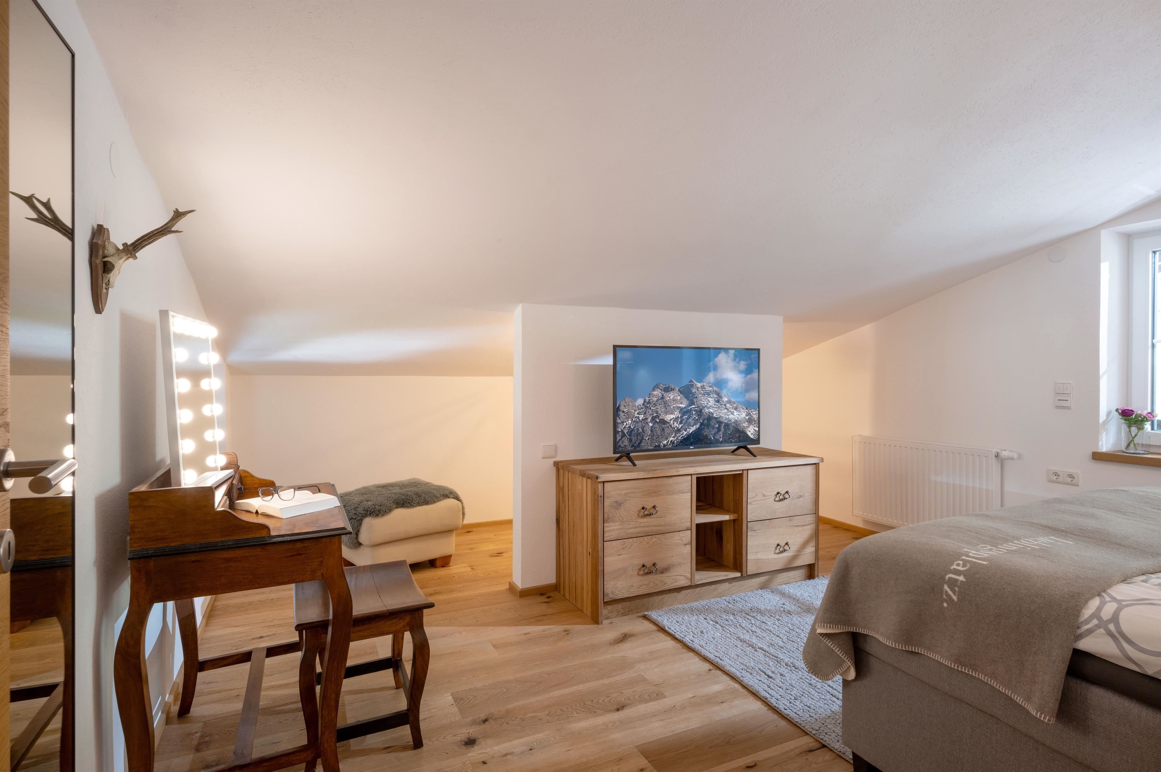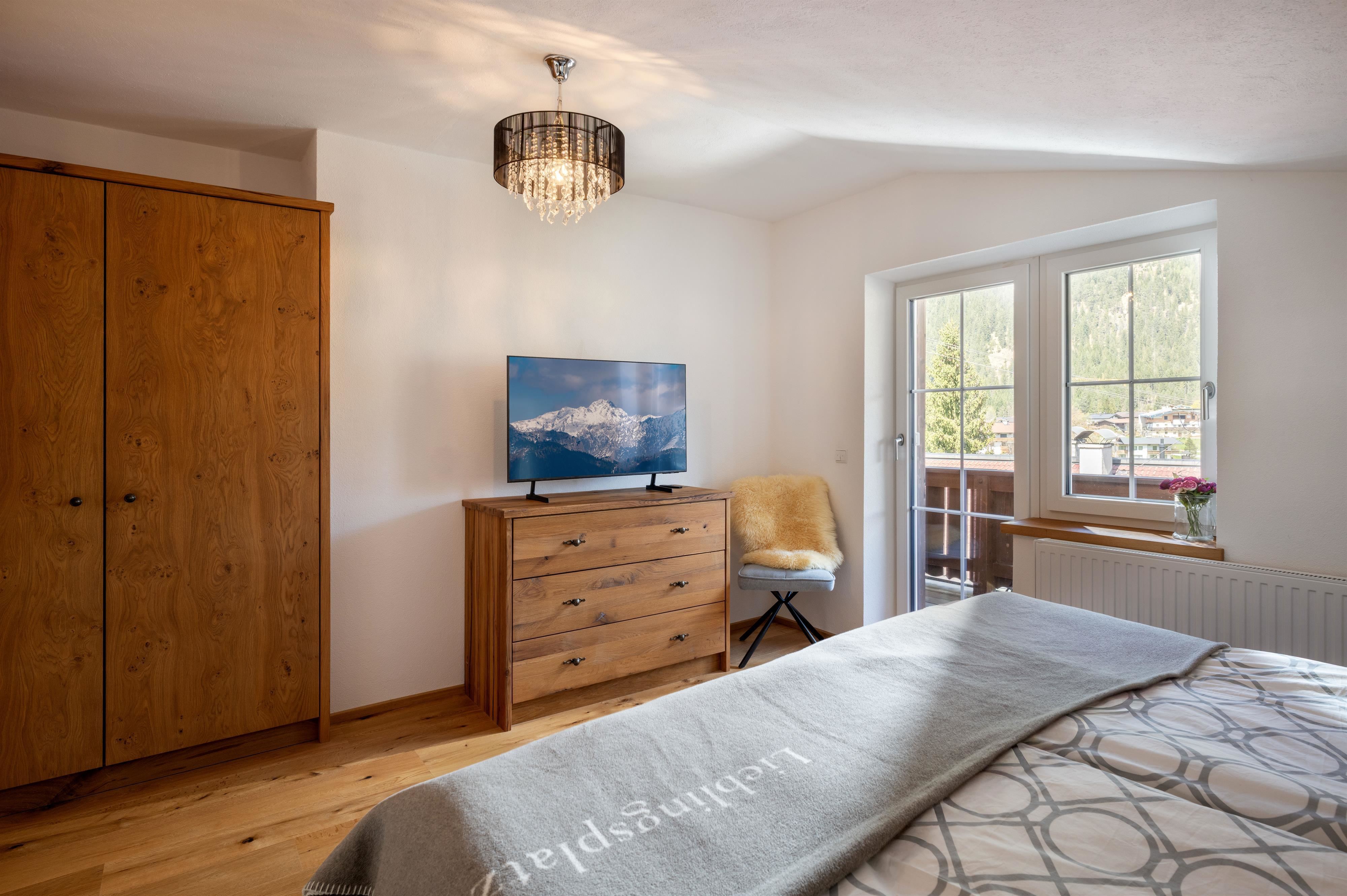 - Two spacious bedrooms: Both bedrooms are furnished with luxurious box-spring beds, guaranteeing you a restful night's sleep. Each room also has a dressing table, TV and access to a large balcony. Choose between a view of the greenery or a panorama of Waidring and the Steinplatte.