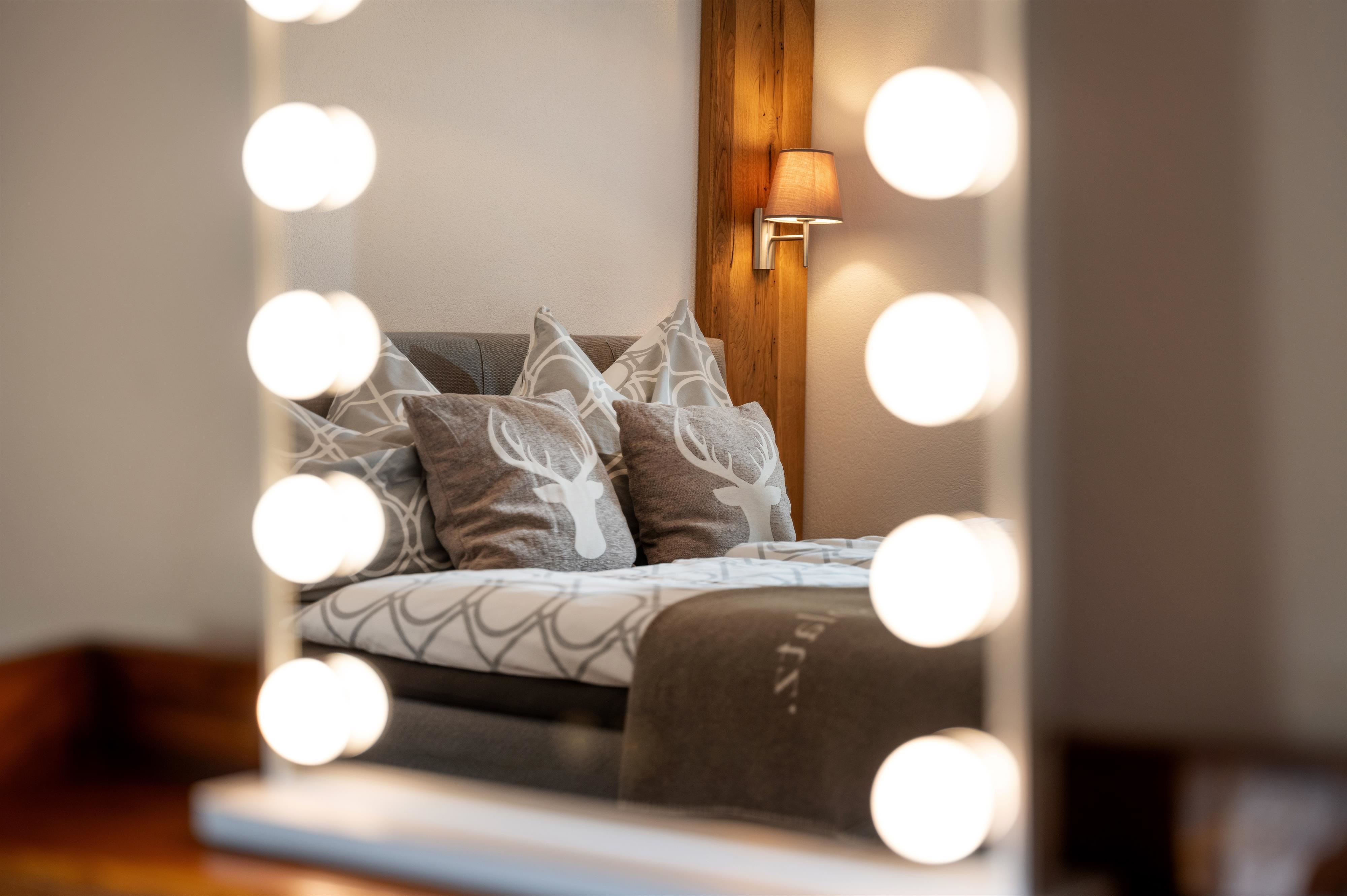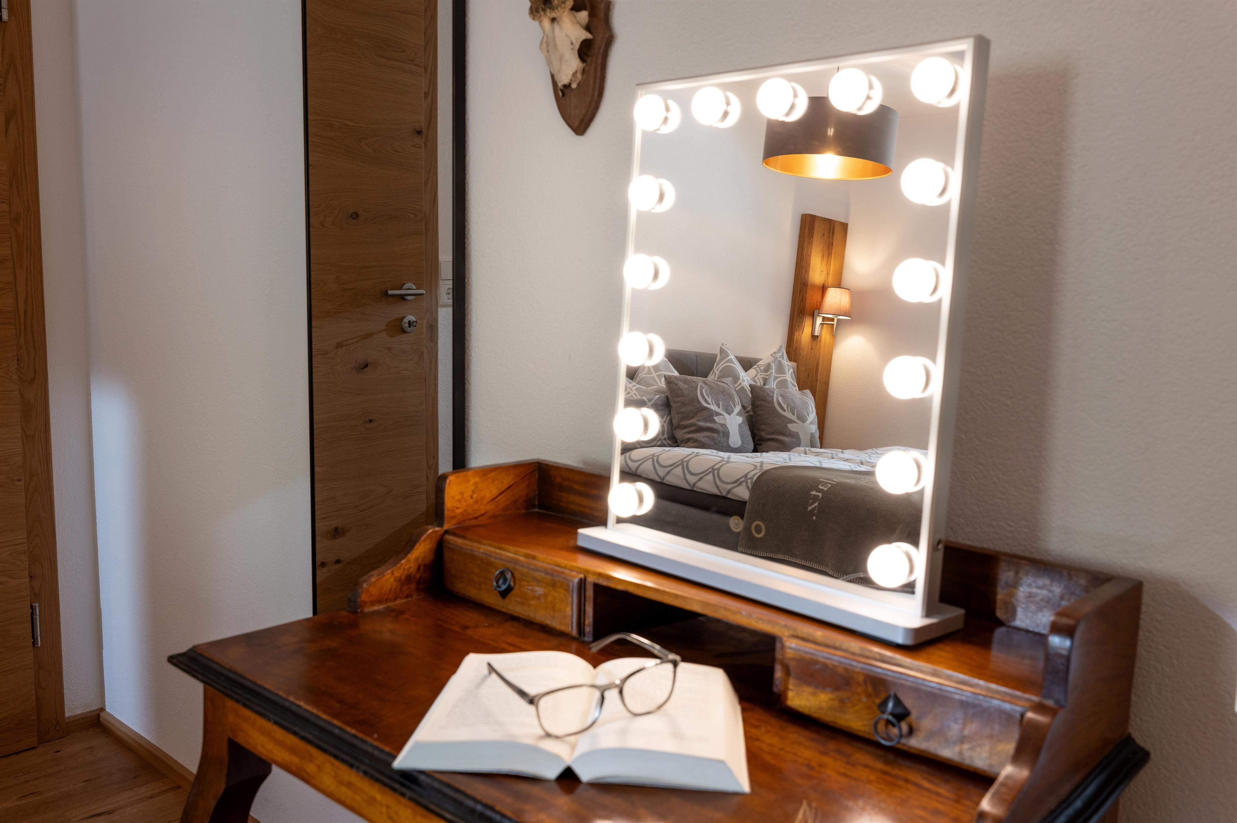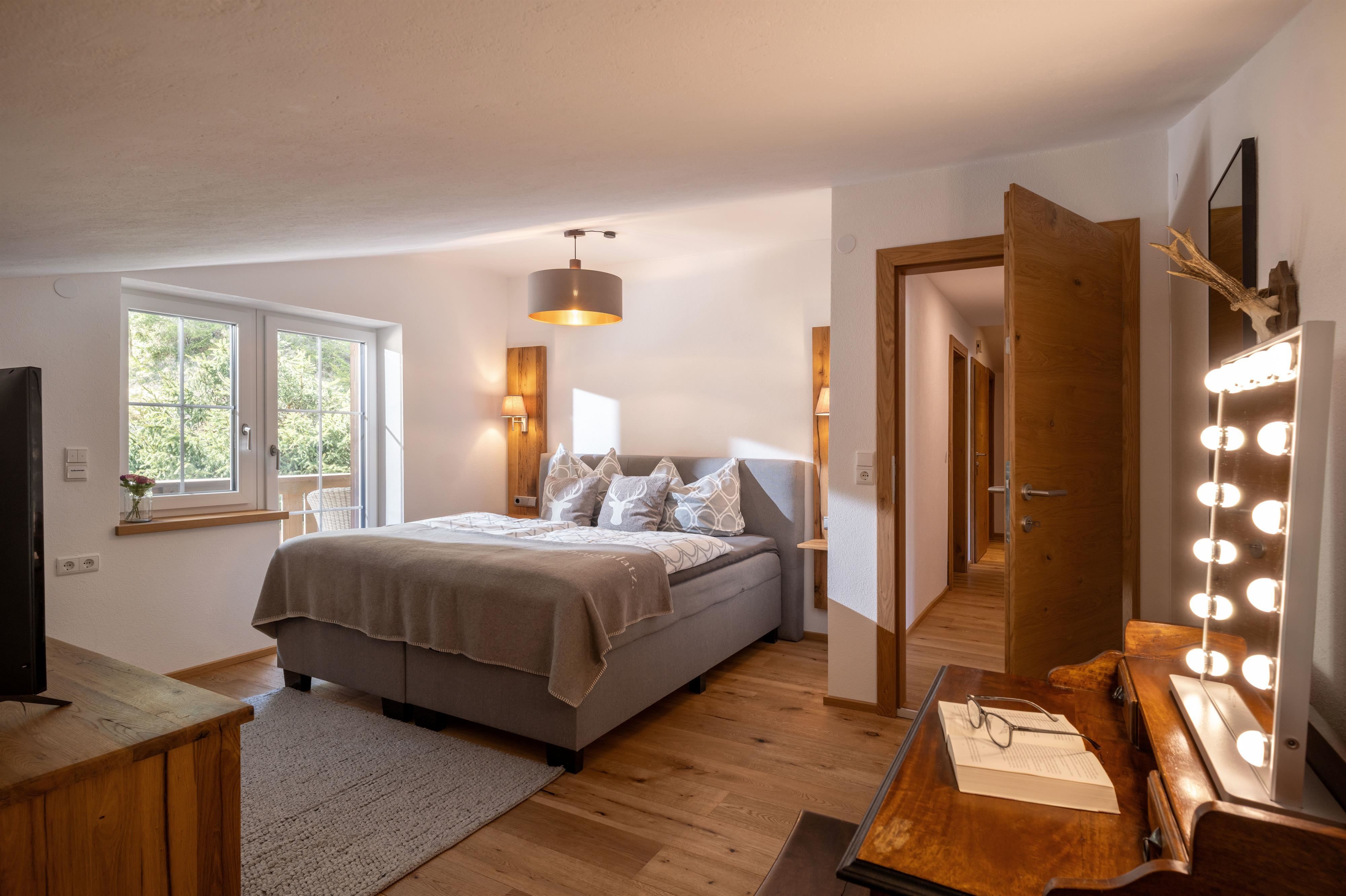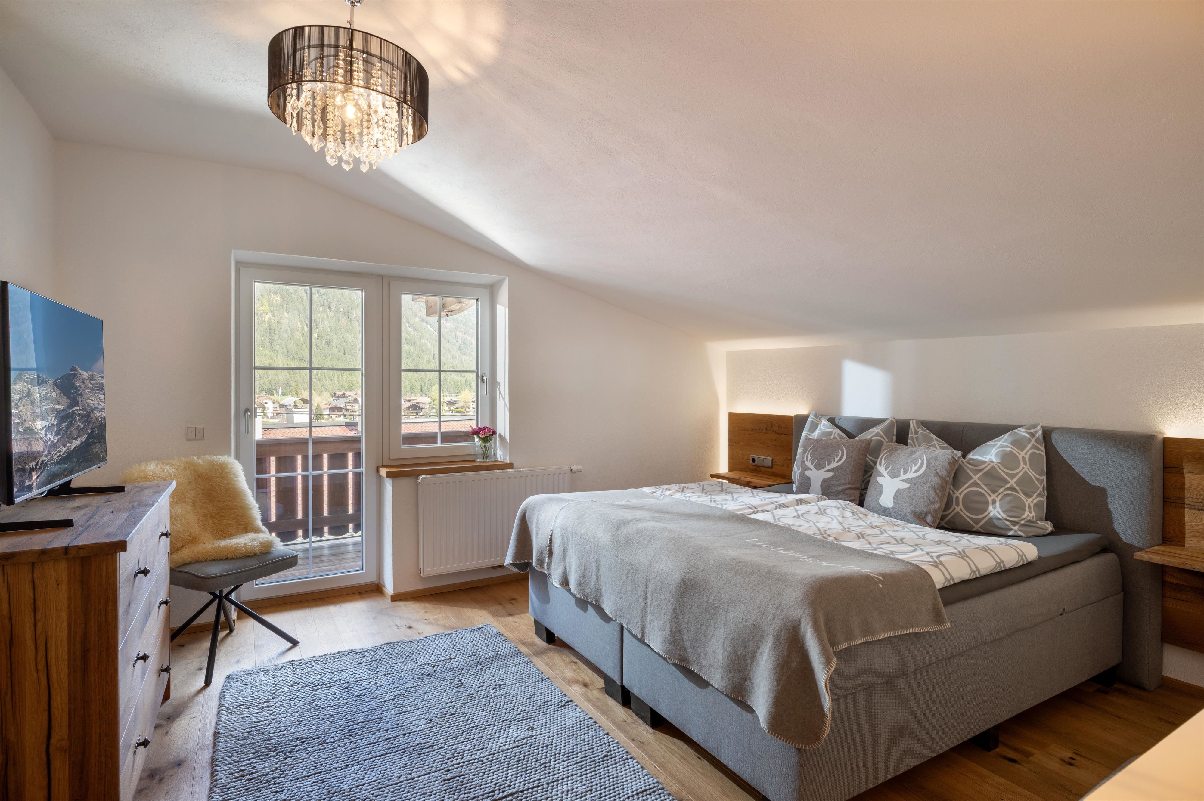 - Two spacious bedrooms: Both bedrooms are furnished with luxurious box-spring beds, guaranteeing you a restful night's sleep. Each room also has a dressing table, TV and access to a large balcony. Choose between a view of the greenery or a panorama of Waidring and the Steinplatte.