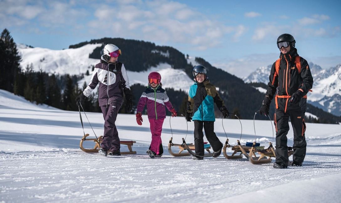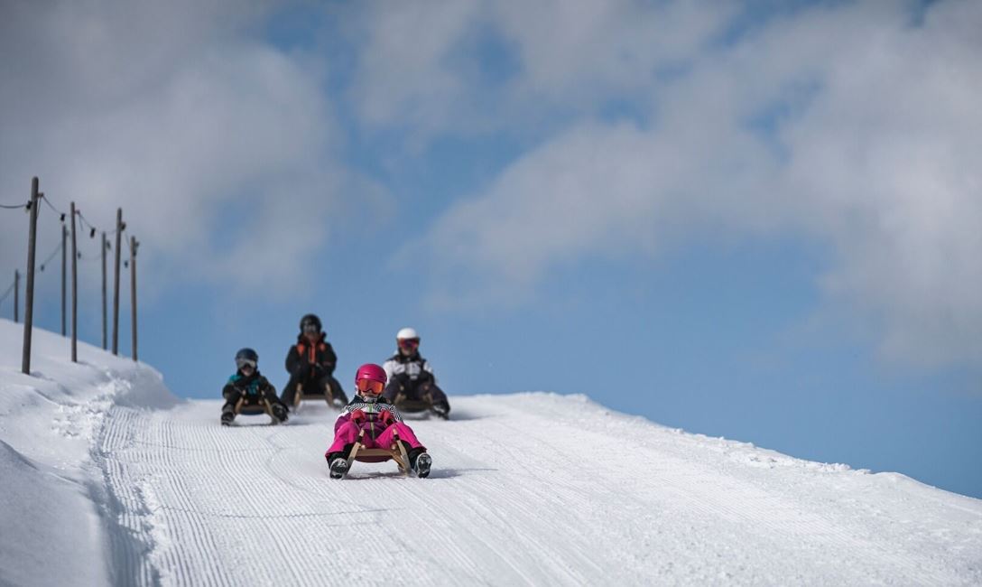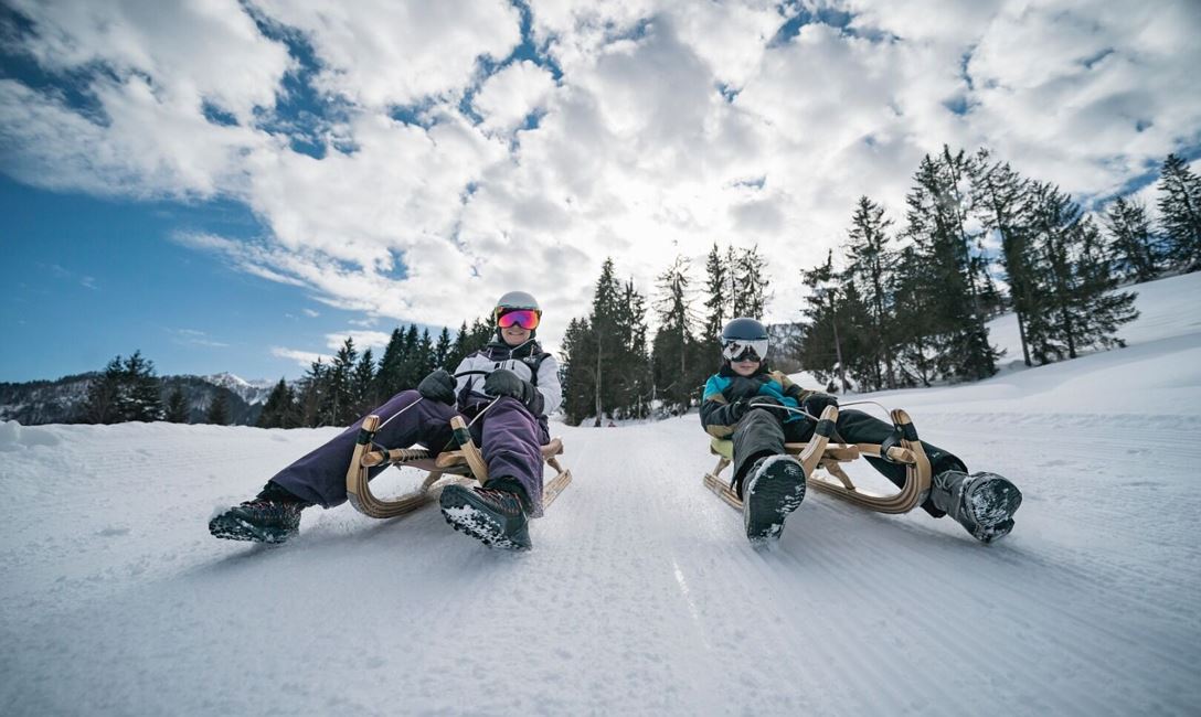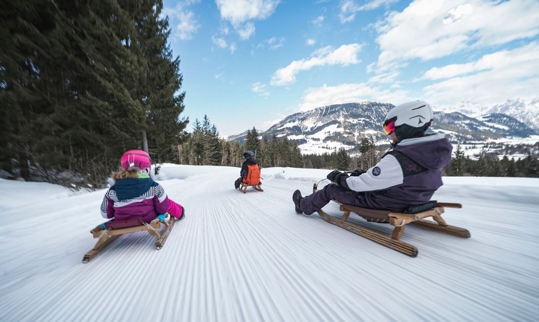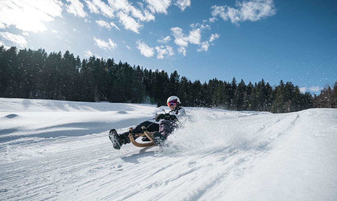 The lower section of the Hochkogel toboggan run begins in the Tragstätt area (Keruezung cross-country ski trail). Free toboggans are available for hire at the finish line and in the Tragstätt area! At the end of the toboggan run, please place the hired toboggans in the designated mesh box.The start can be reached either by taxi (not by car – no parking available!) or on foot. Ascent to the start of the entire toboggan run via the rolled winter hiking trail from the car park (2 km / 250 m elevation gain / 1 hour walking time).Refreshments available at Farmhotel & Chalets Grosslehen. The entire toboggan run begins below Hochkogel at the Egg farm.
