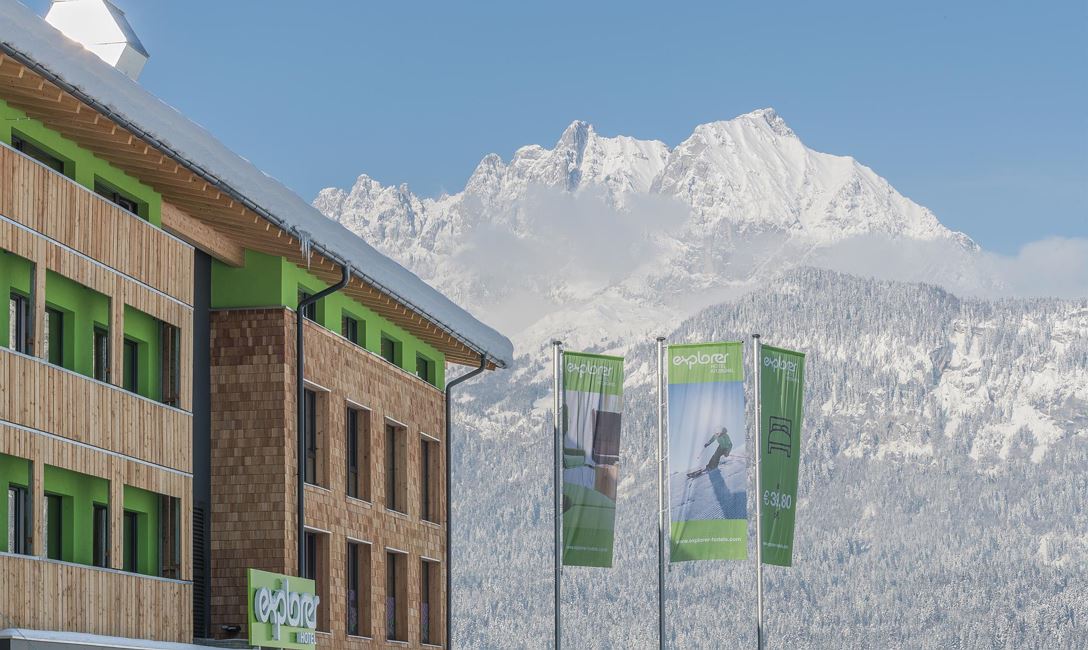 The Explorer Hotel Kitzbüehl is a trendy and climate-neutral sports hotel located in between the alps. It offers sporty holidays for a good price and takes care of our nature.