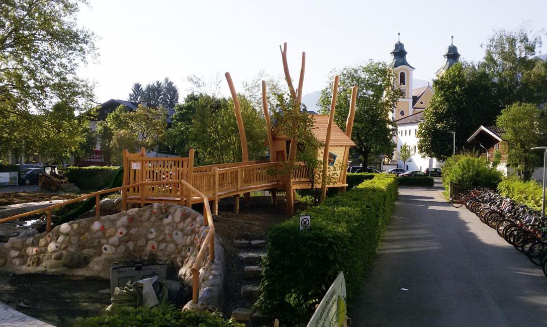 In the middle of the schoolyard, there is a real play oasis with climbing rocks, a playhouse, a water area with a pier, a slide, a roundabout, balance beams ...