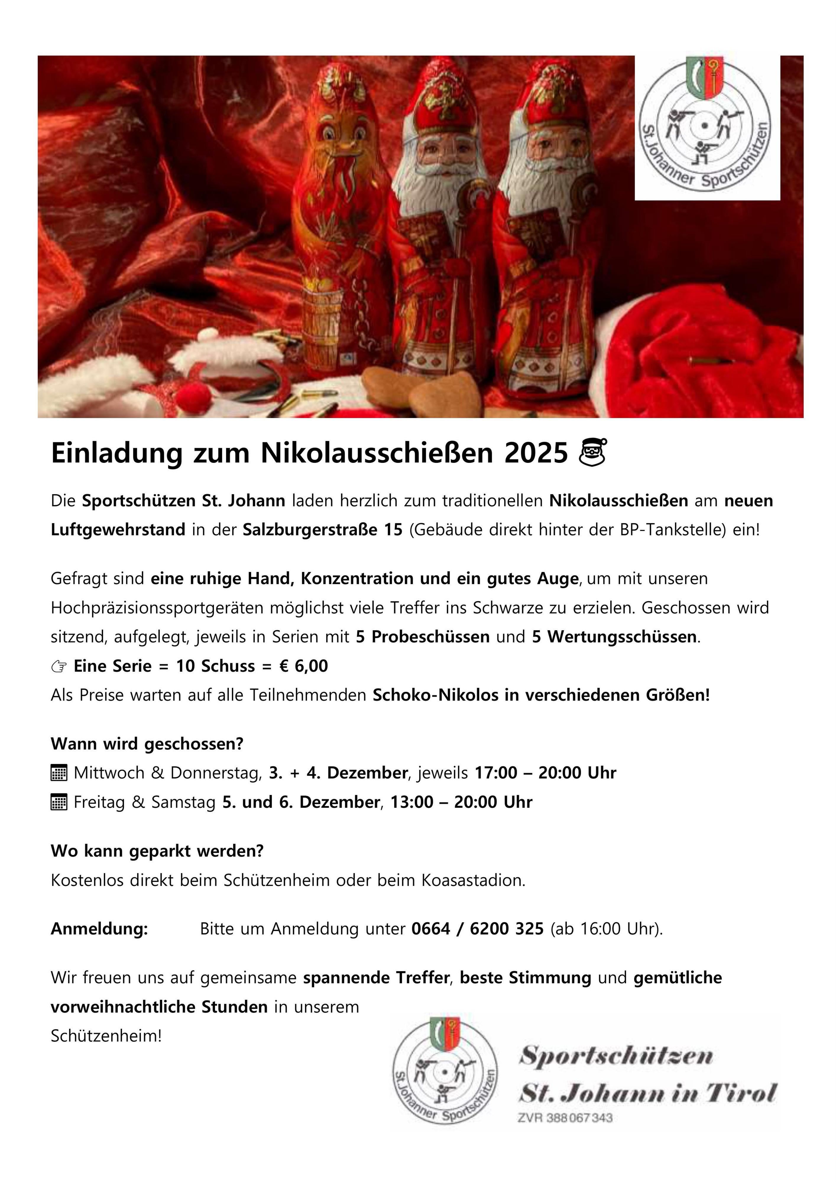 The sports shooters of St. Johann warmly invite you to the traditional Nikolaus shooting at the new air rifle range on Salzburgstraße 15 (building directly behind the BP gas station)!