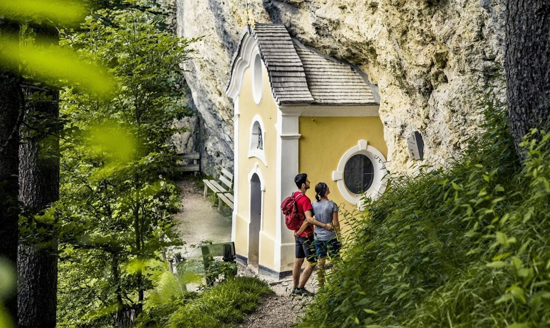 The hike continues down through the forest to a clearing near the road. At the last bend, the trail turns right again into the forest. Passing a paddock you will get back to the hermitage Einsiedelei. From here, take the same path back to the parking lot, where the Gasthof Rummlerhof offers a refreshment stop.