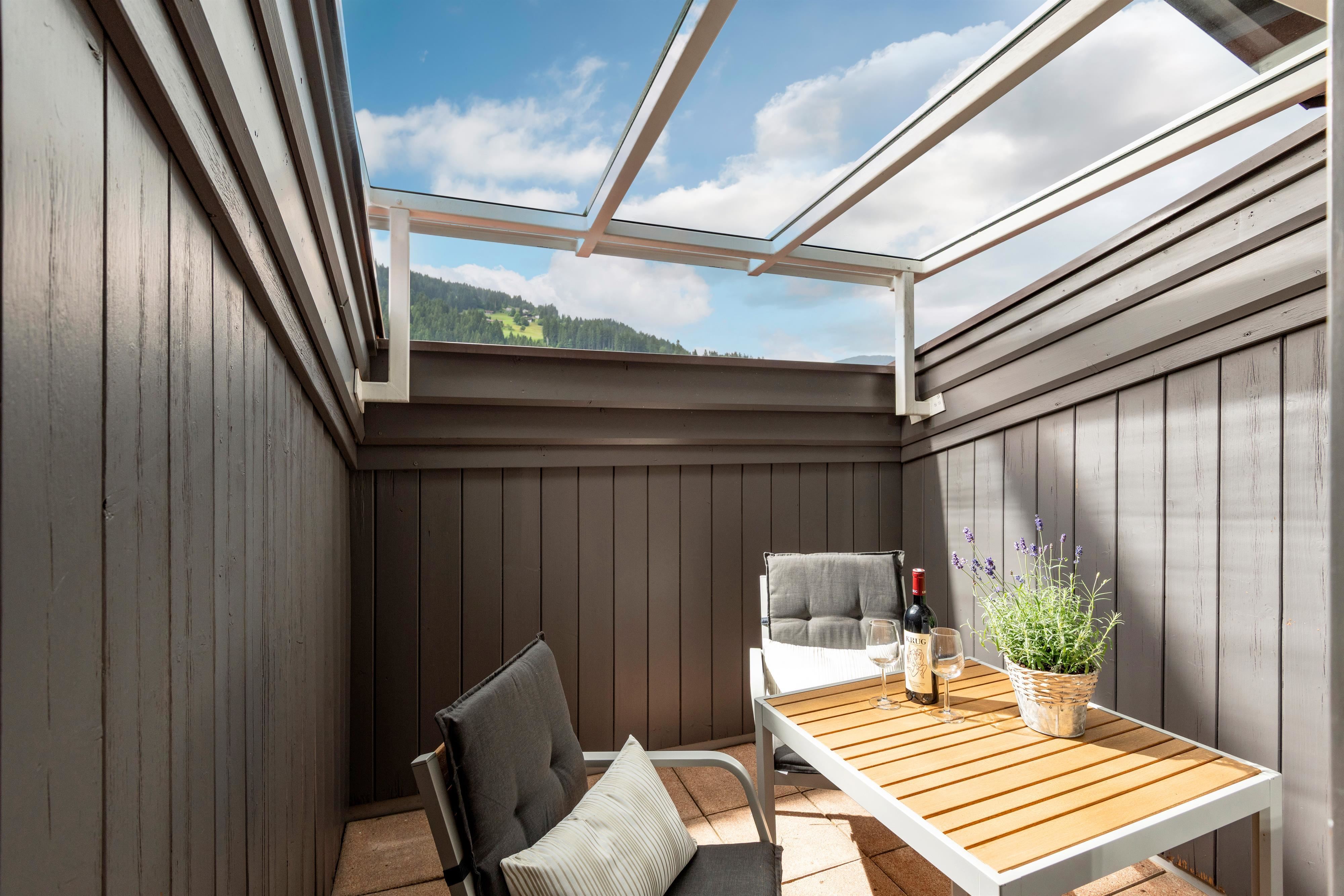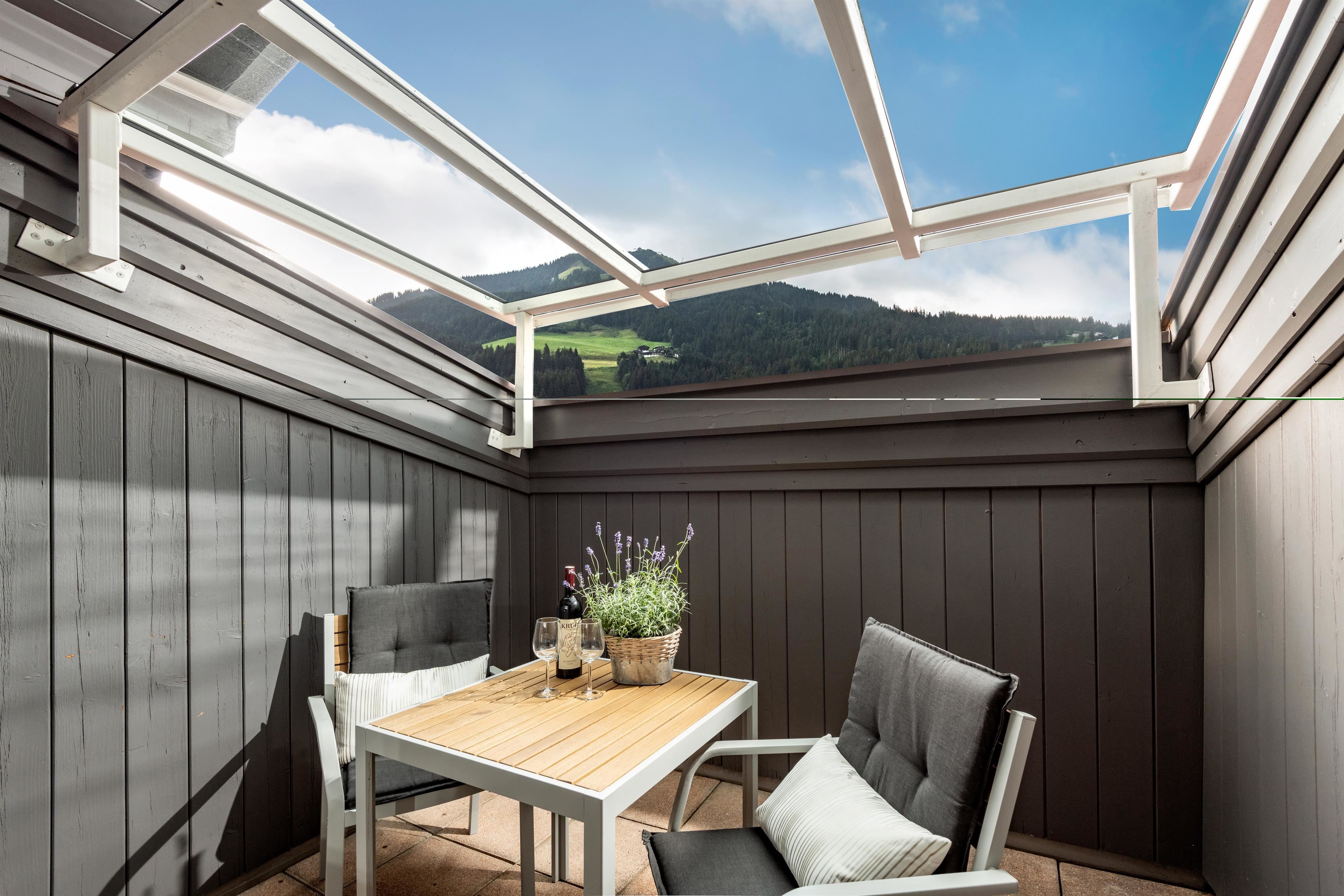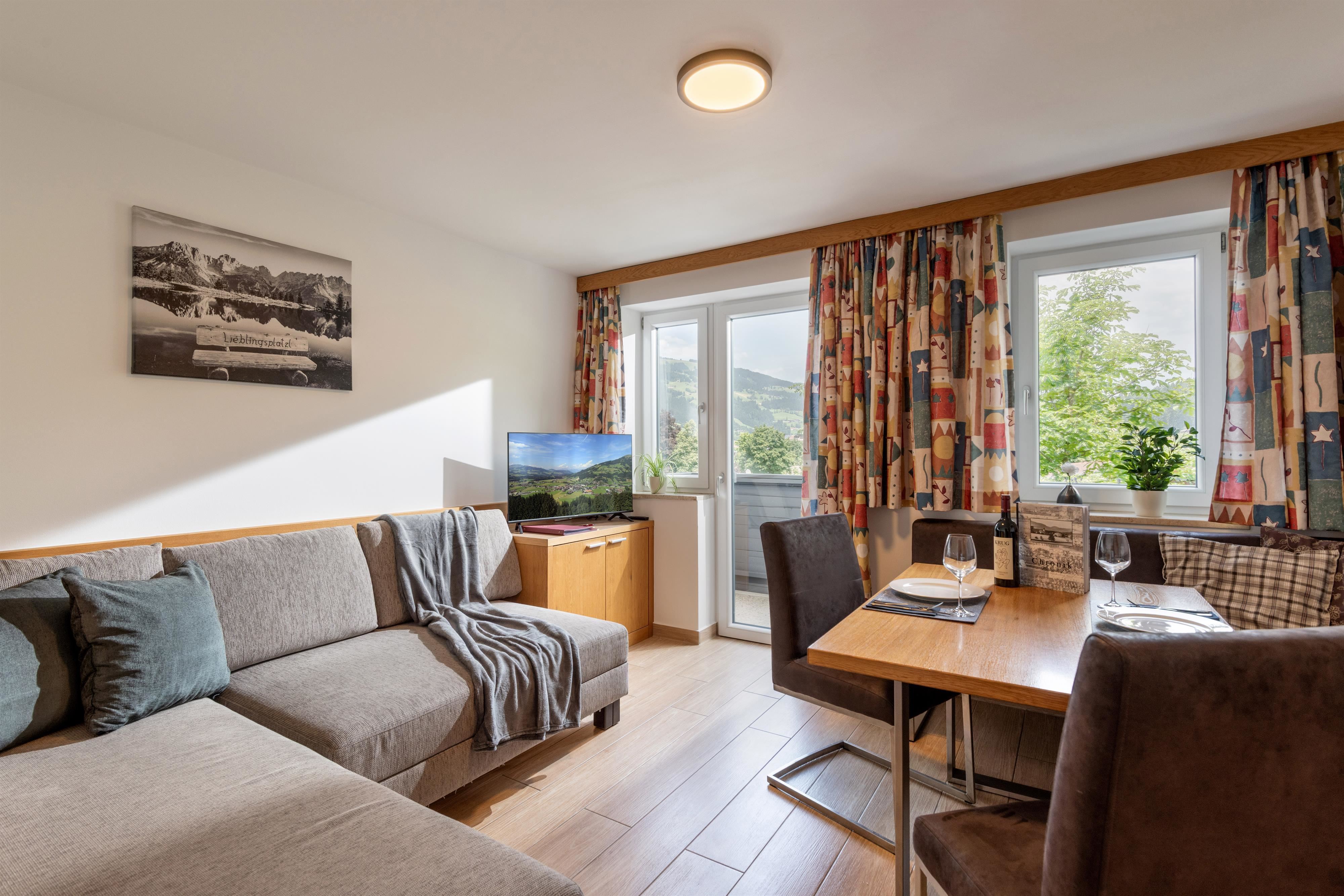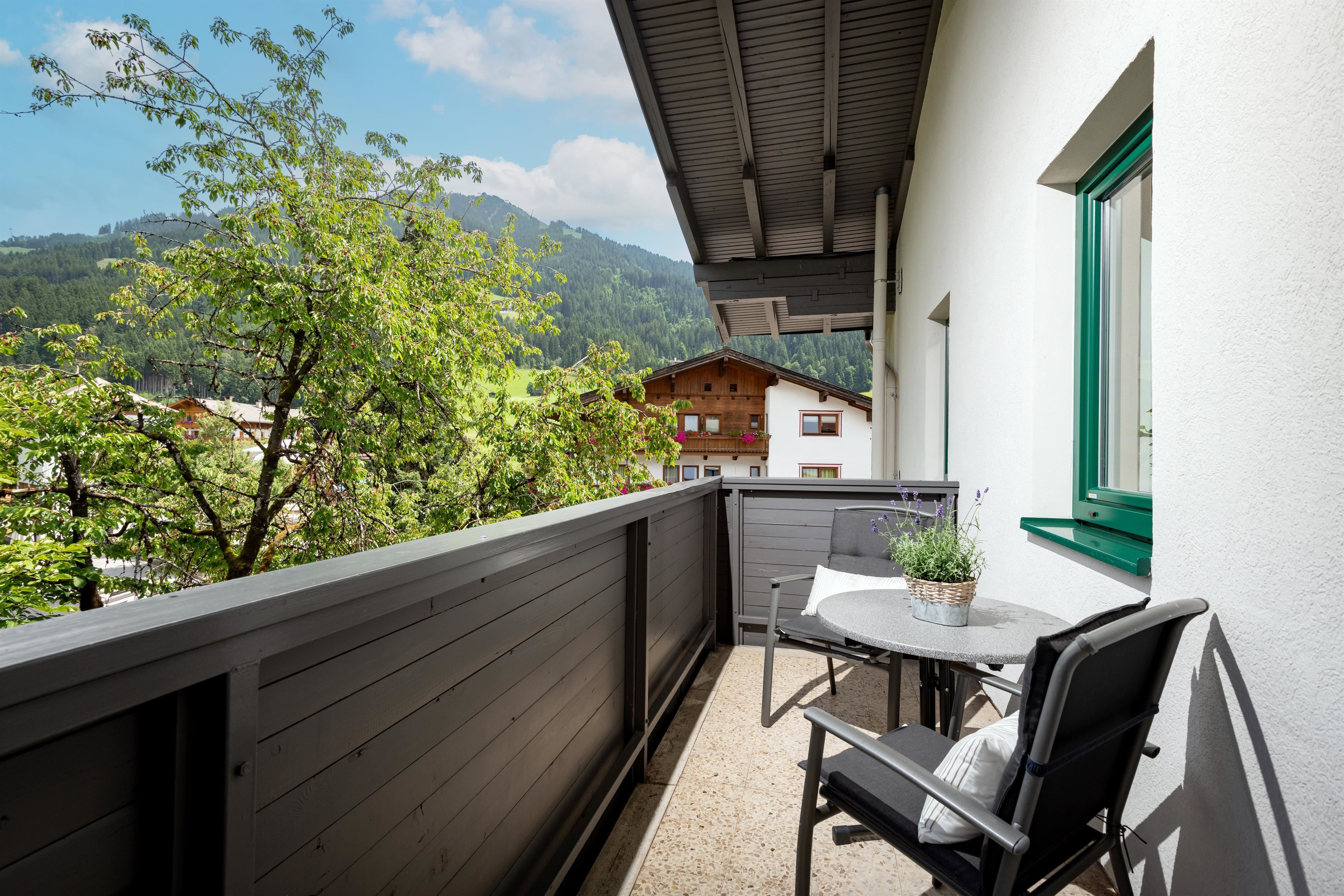 Compleet gerenoveerd appartement, ca. 70 m², 2 slaapkamers, woonkamer met bank, compleet ingerichte keuken, eethoek, balkon met uitzicht op de Kitzbüheler Alpen, kapstok, 1 badkamer met douche/wc en 1 badkamer met bad/wc.