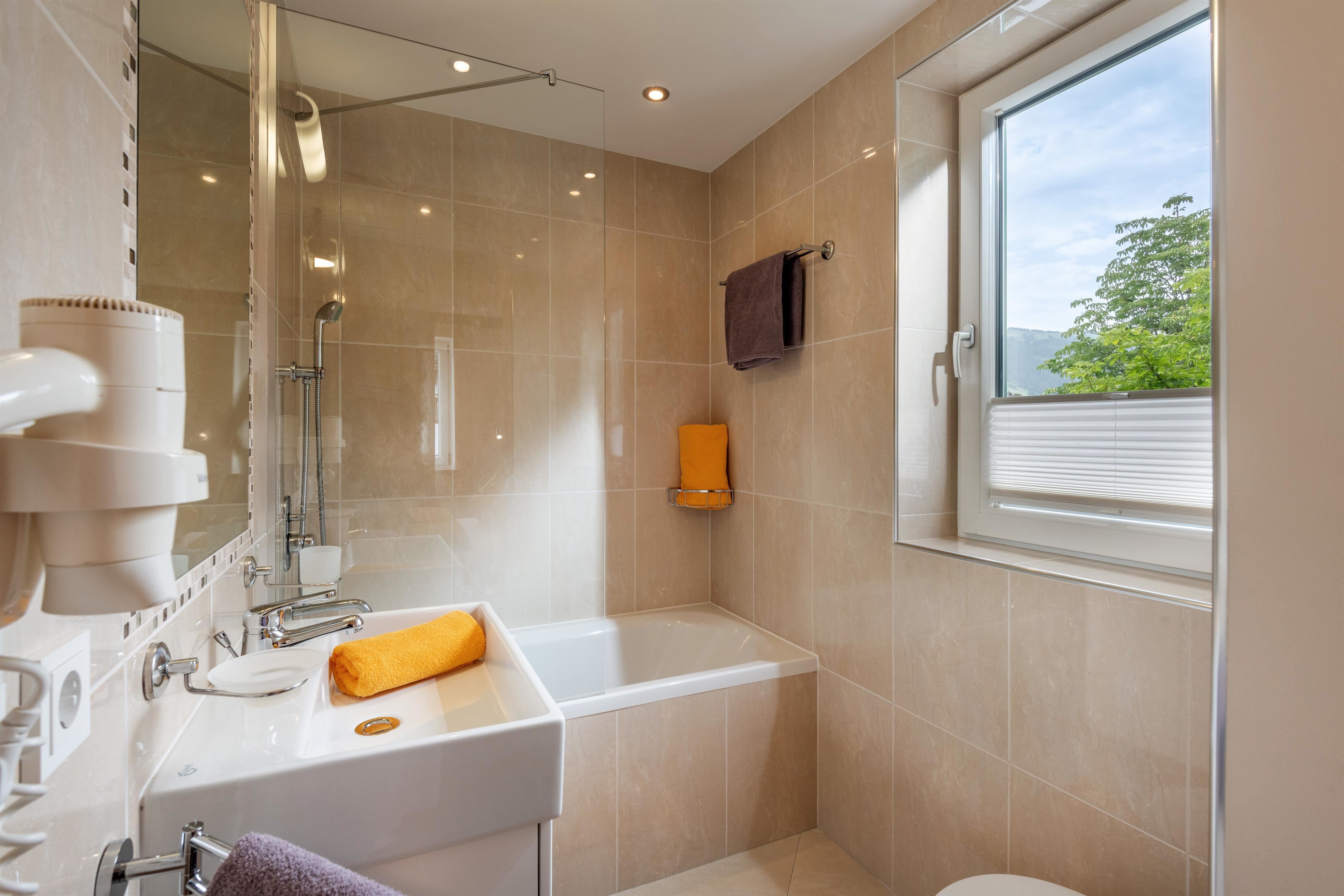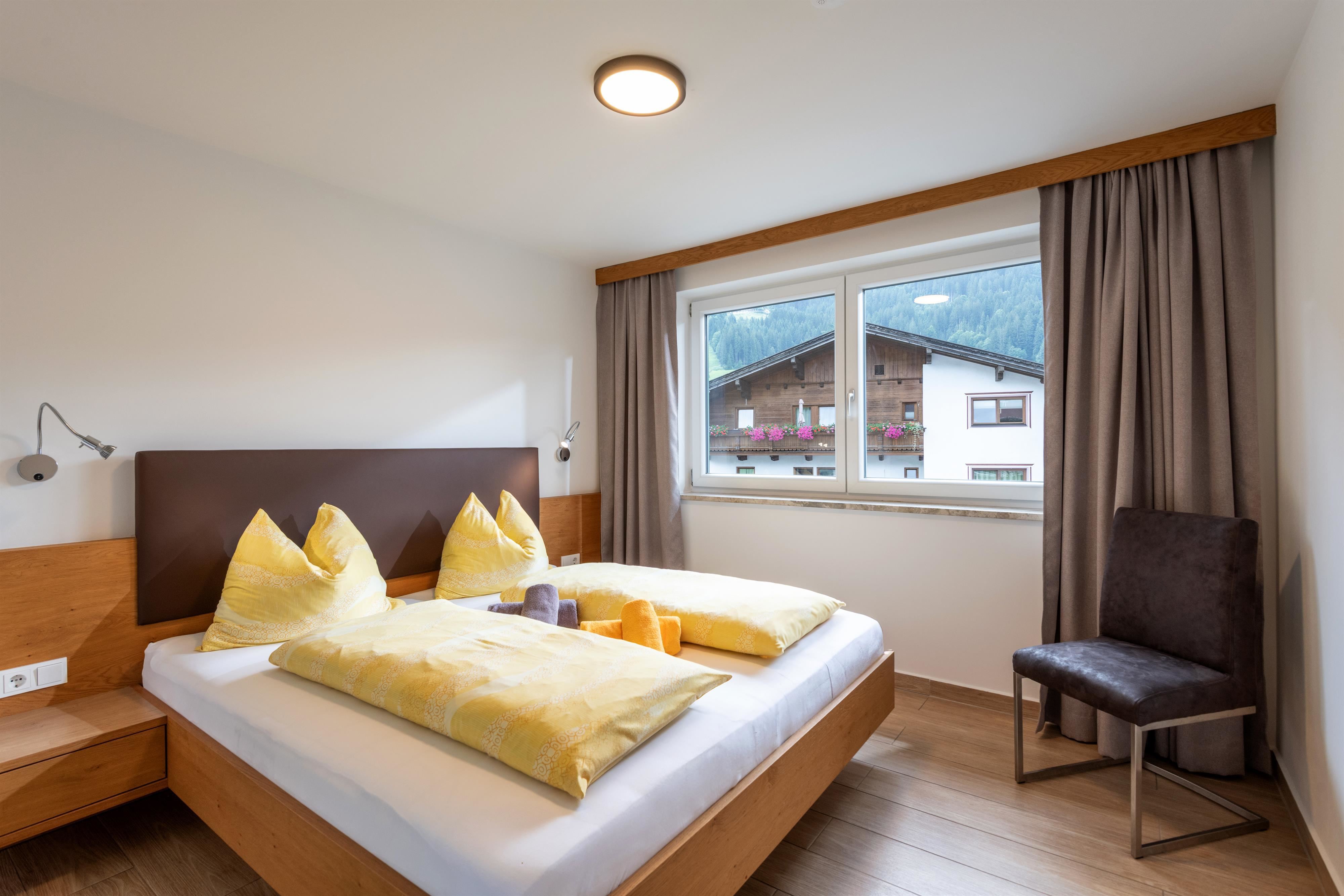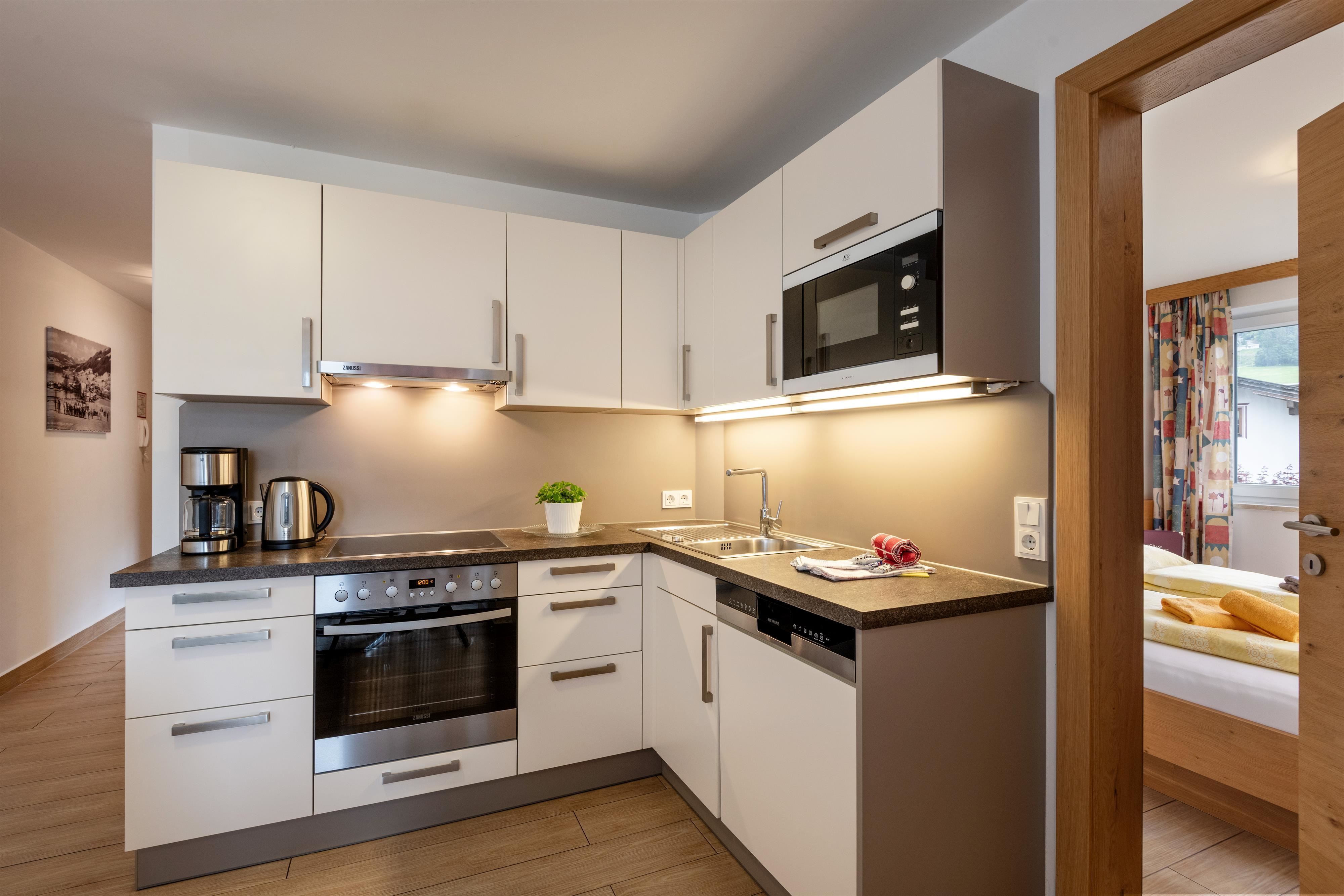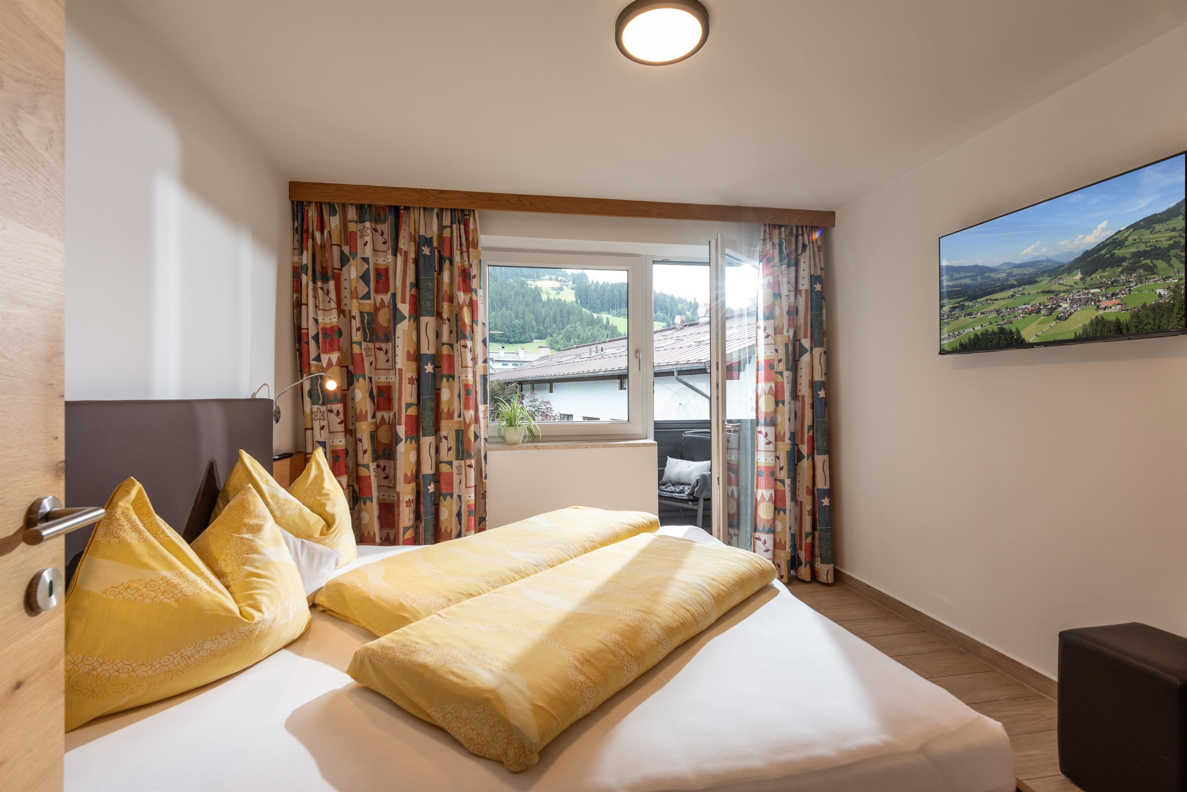 Compleet gerenoveerd appartement, ca. 100 m², 2 slaapkamers, 1 vier-persoonskamer, tv met dvd-player, compleet ingerichte keuken, eethoek met tv, balkon met uitzicht op de Kitzbüheler Alpen, kapstok, 1 grote badkamer met bad/wc en 1 badkamer met douche/wc.