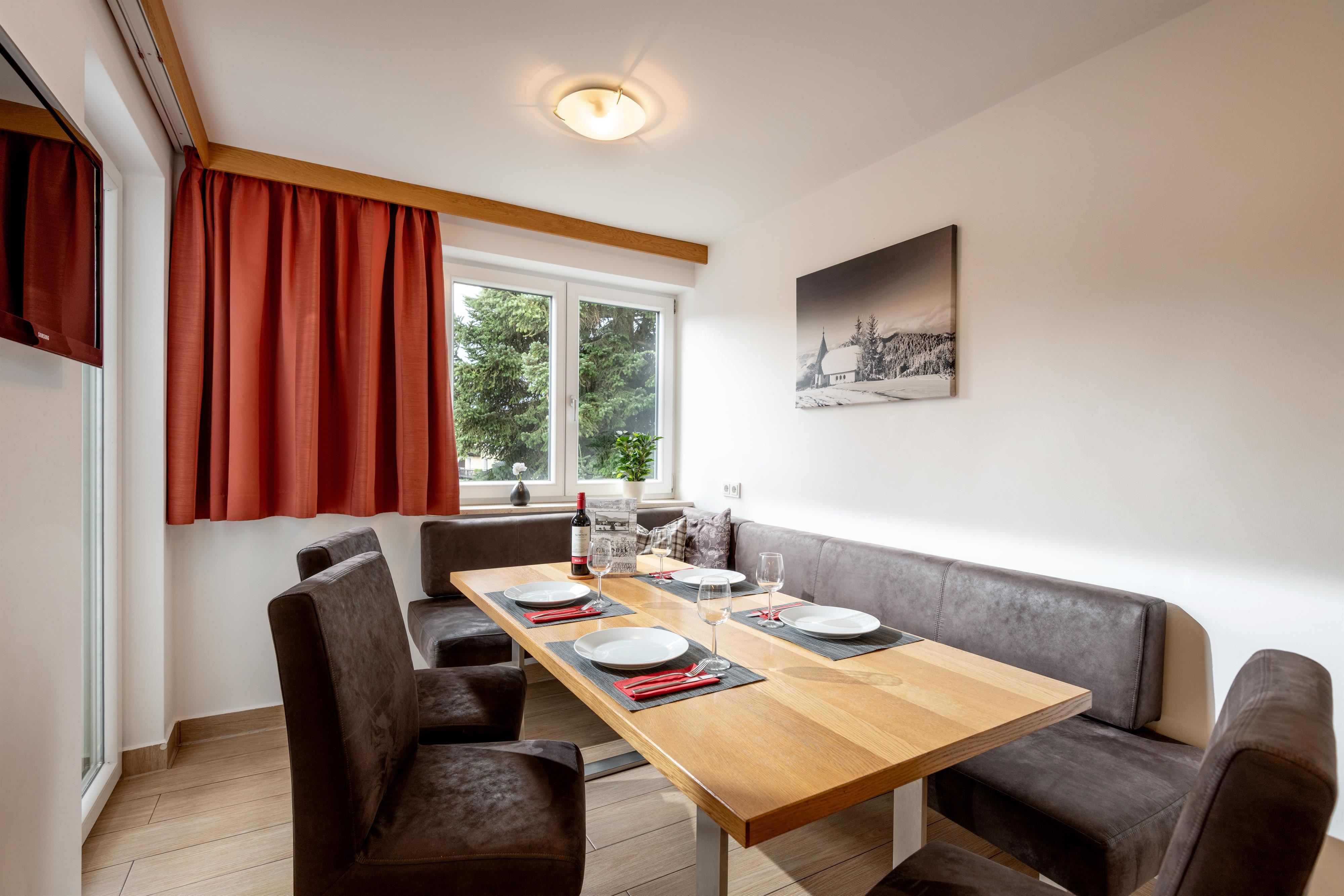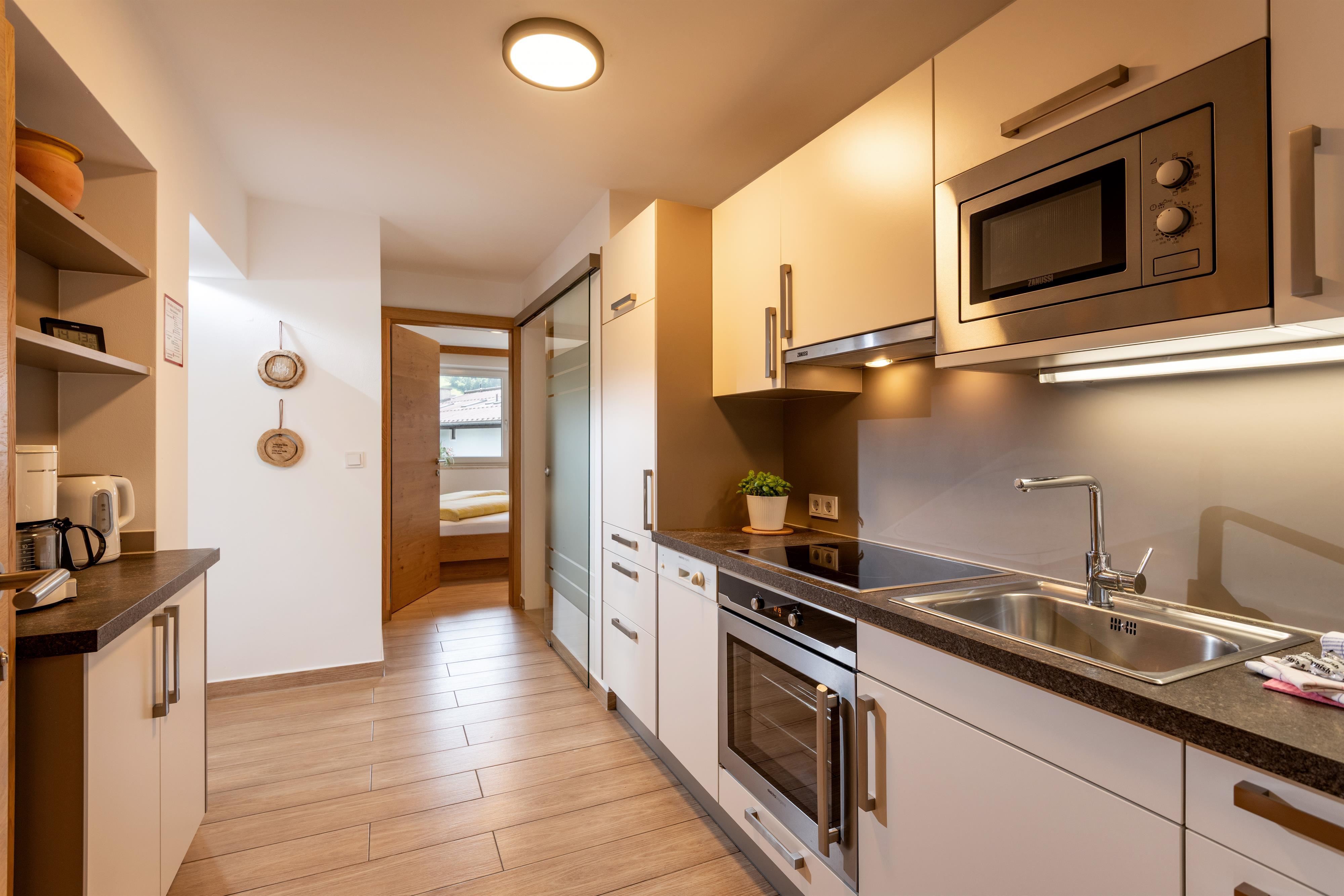 Appartement in Tiroolse stijl, ca. 70 m², 1 slaapkamer, woonkamer met bank, woonkeuken, eethoek, grote badkamer met douche en bad, separate wc, compleet ingerichte keuken (2e slaapkamer met bad/wc, eigen entree).