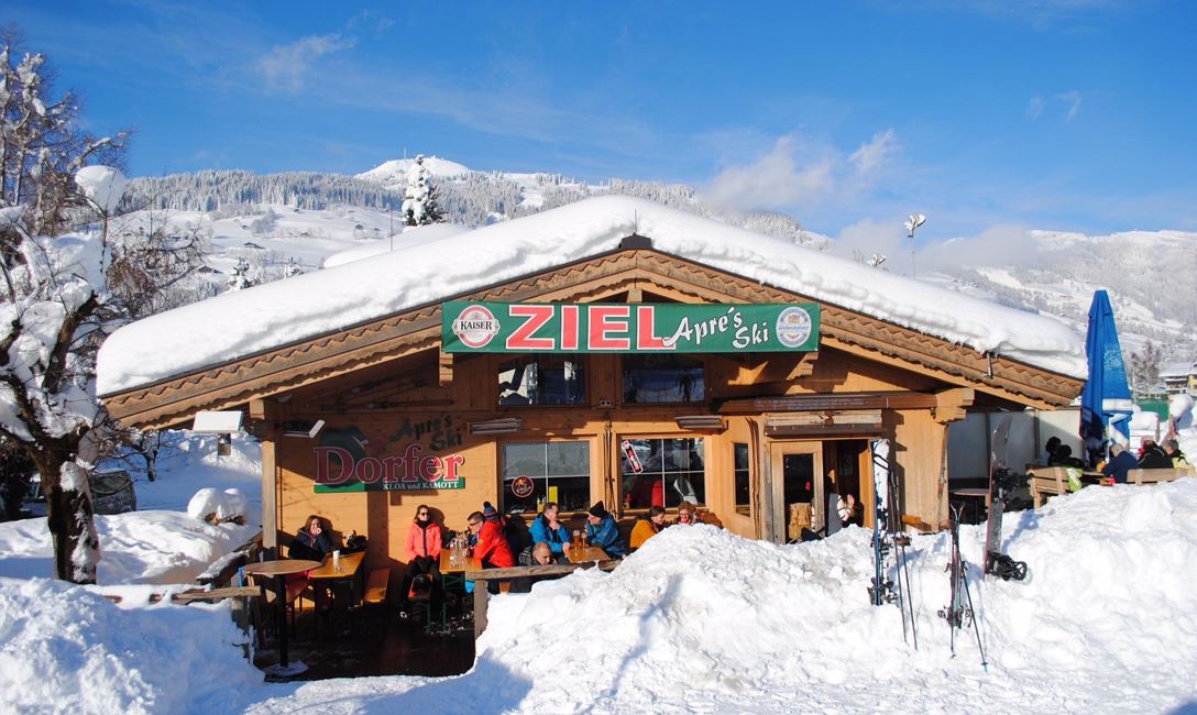 Gezellige rustieke après-ski bar met zonneterras direct aan de oefenweide in Westendorf. In de zomertuin met een geweldige speeltuin, trampoline en elektrische auto's.