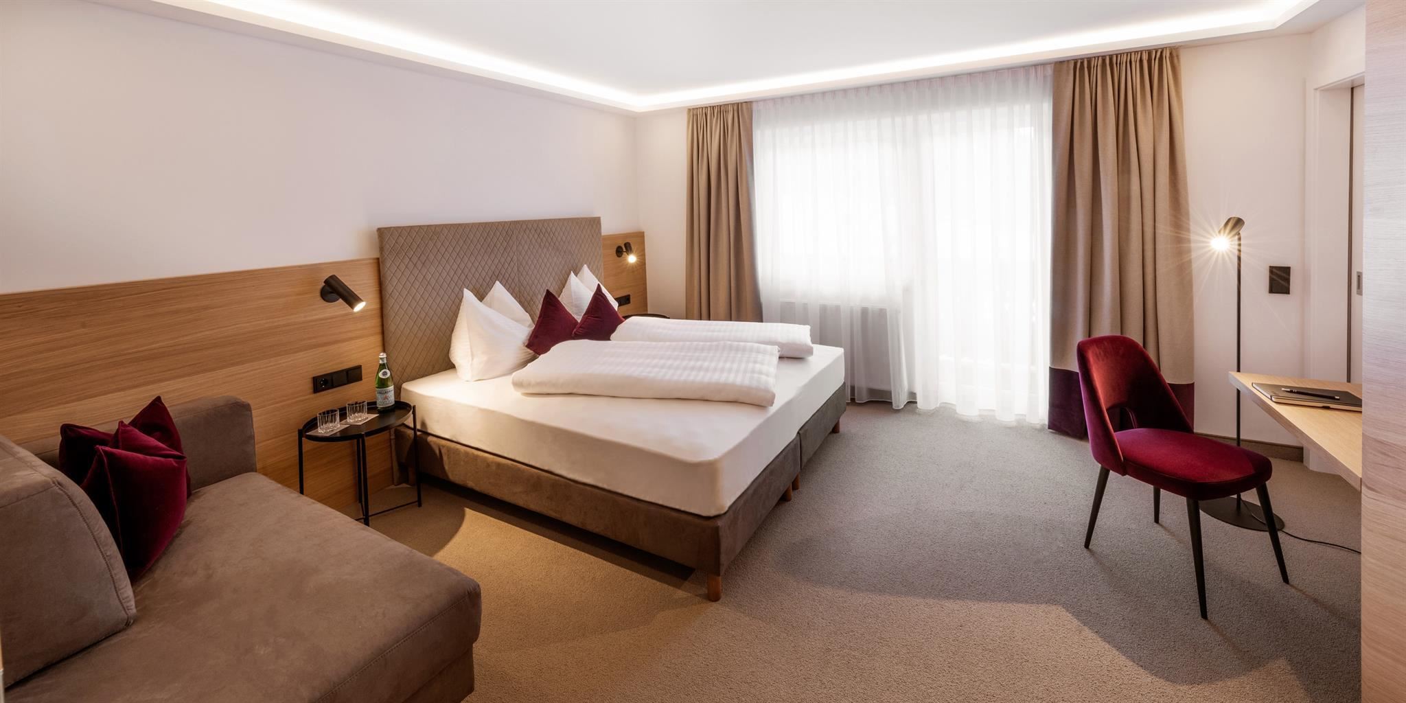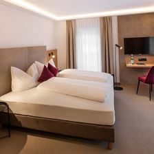 Rustige kamer met modern meubilair, ingericht met hoogwaardige materialen en natuurlijke kleuren, buro met flatscreen tv met sat-programma, gratis wifi, badkamer met wc en grote regendouche, föhn, spiegel en bio-verzorgingsset.